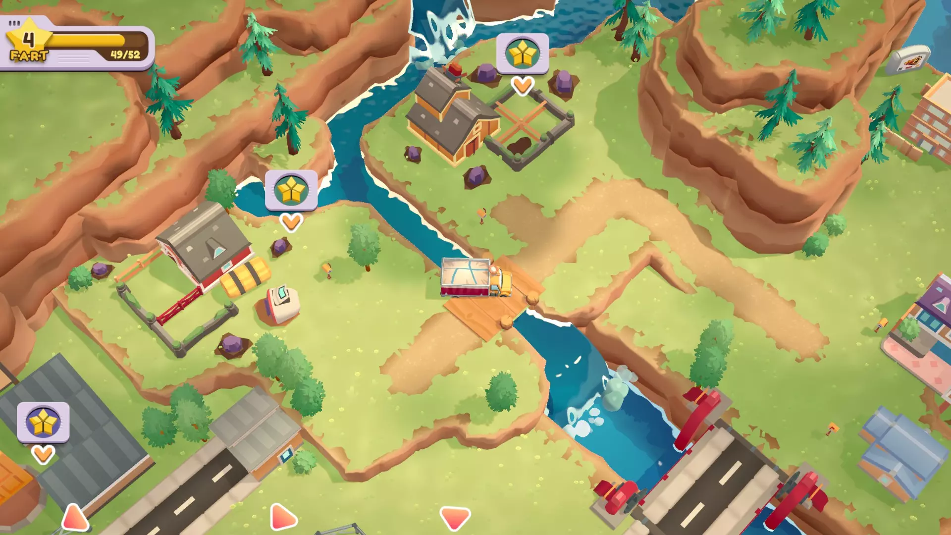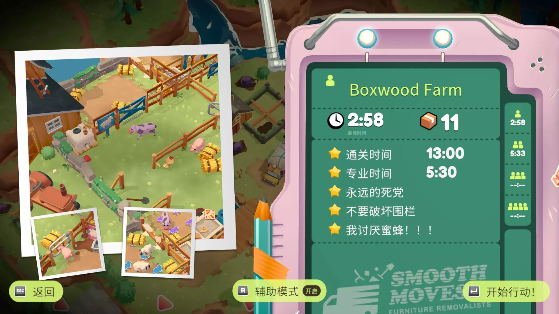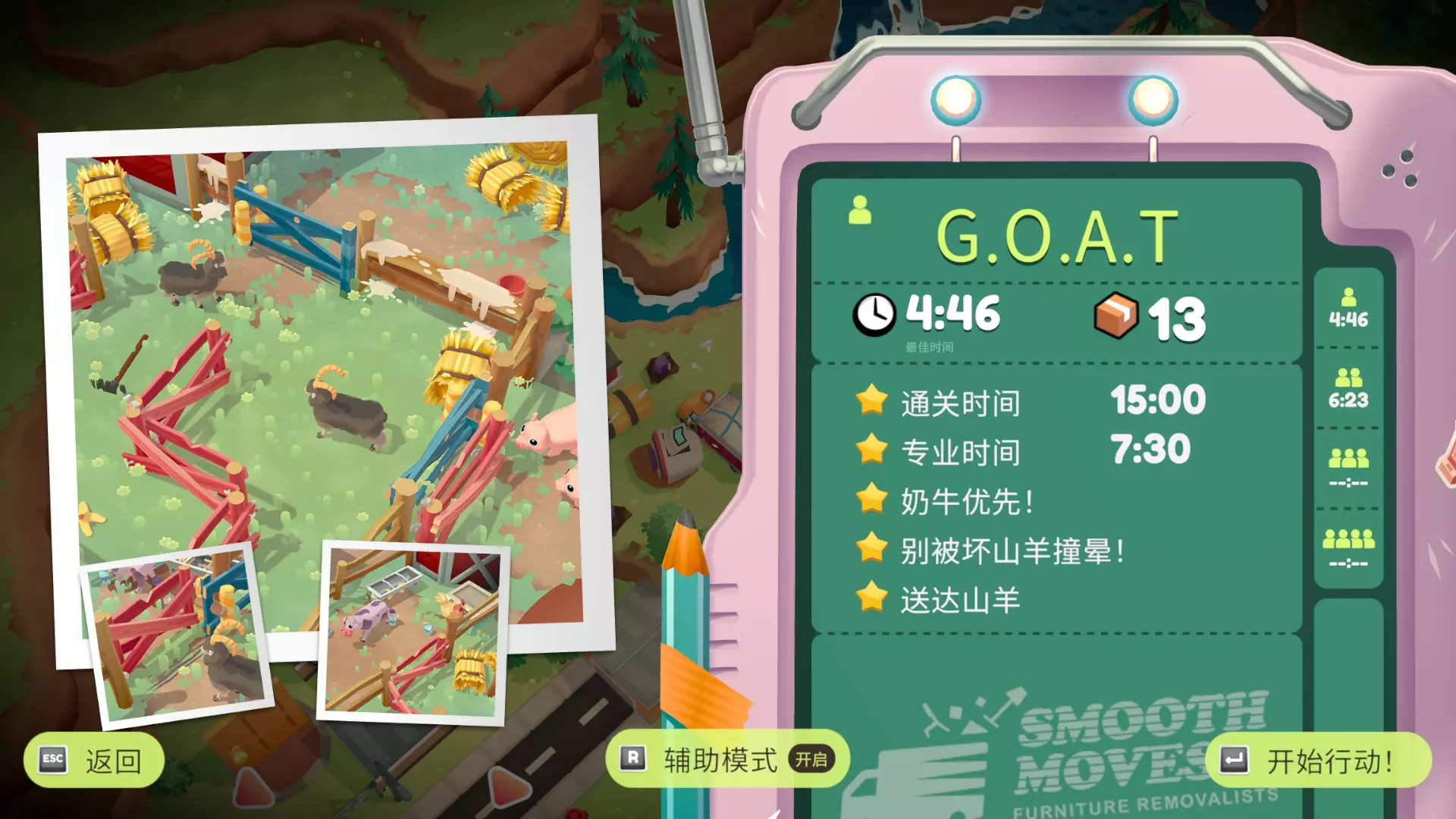 奶牛优先! 先运送奶牛上车,红色围栏要引诱山羊撞破 别被坏山羊撞晕! 山羊冲锋前摇很长,而且开冲之后不会转弯,看见红色感叹号就拉开距离 送达山羊 把山羊运上车,建议放后面再运,山羊会把门撞开 锁匠小屋