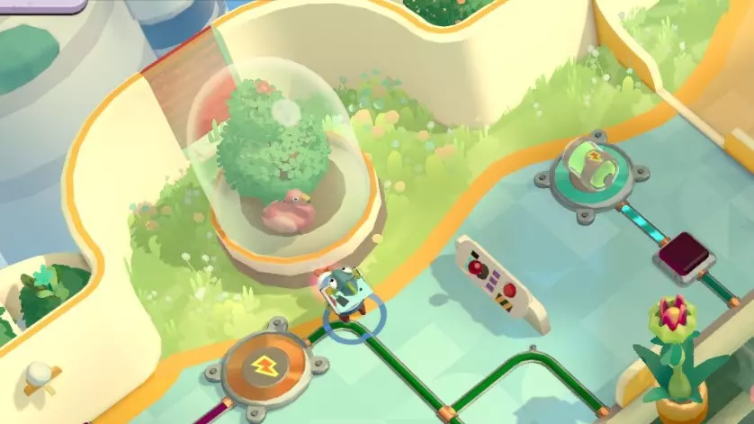 单人完成建议先把各个机关调整为图中状态,然后按顺序互动:全程只有上面的电池需要移动,先拉1,然后拉2,接着再拉1,回去保持2的状态,将电池放在3处,再把电池放在4处,拉5。注意不要砸碎电视! 需要运送的就是那个球,途中不要让它冒出电火花即可。 揭示火烈鸟
