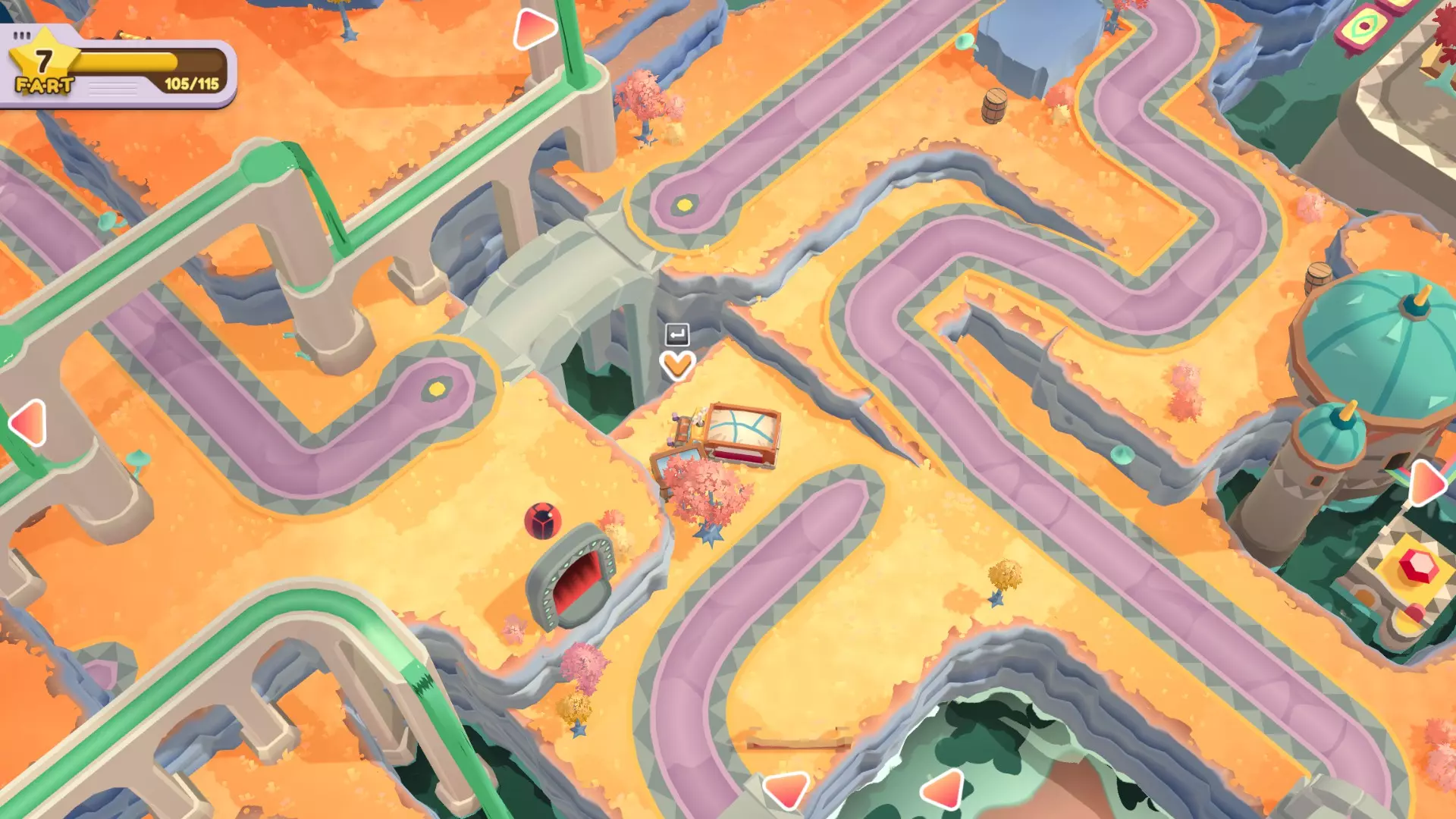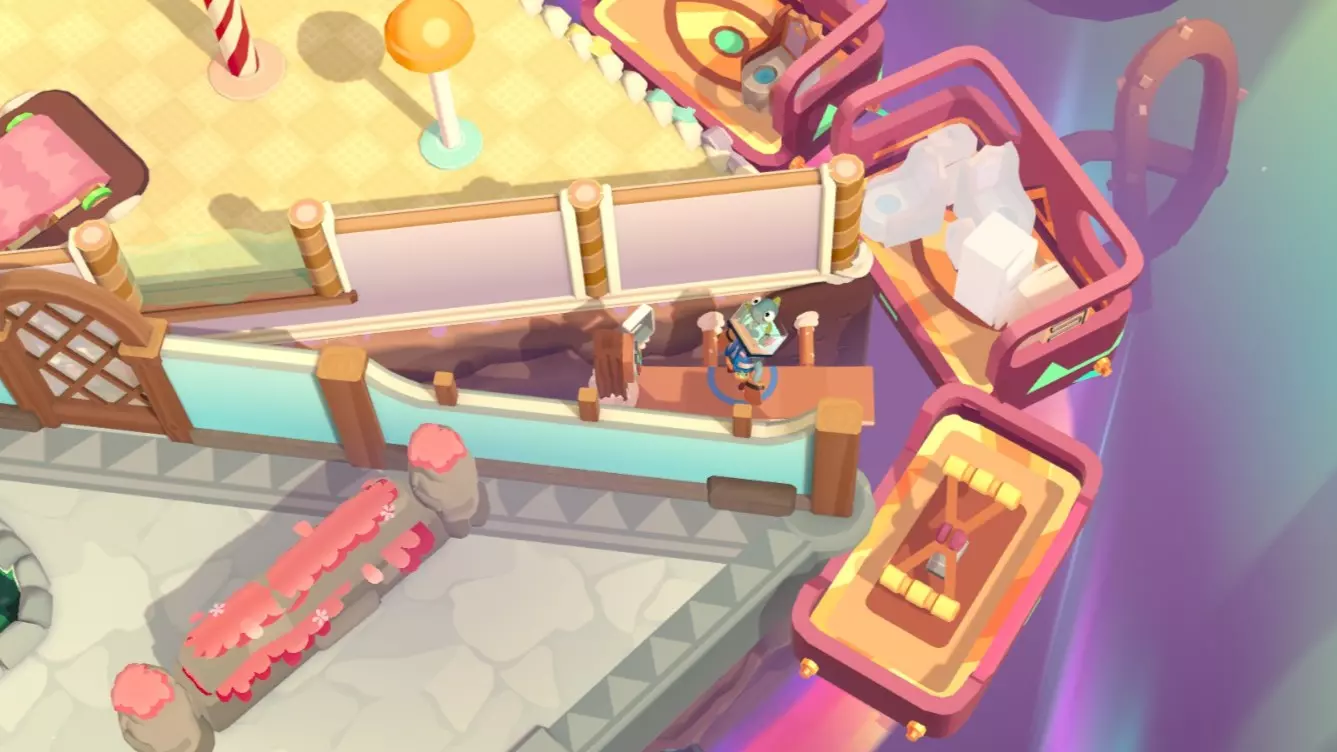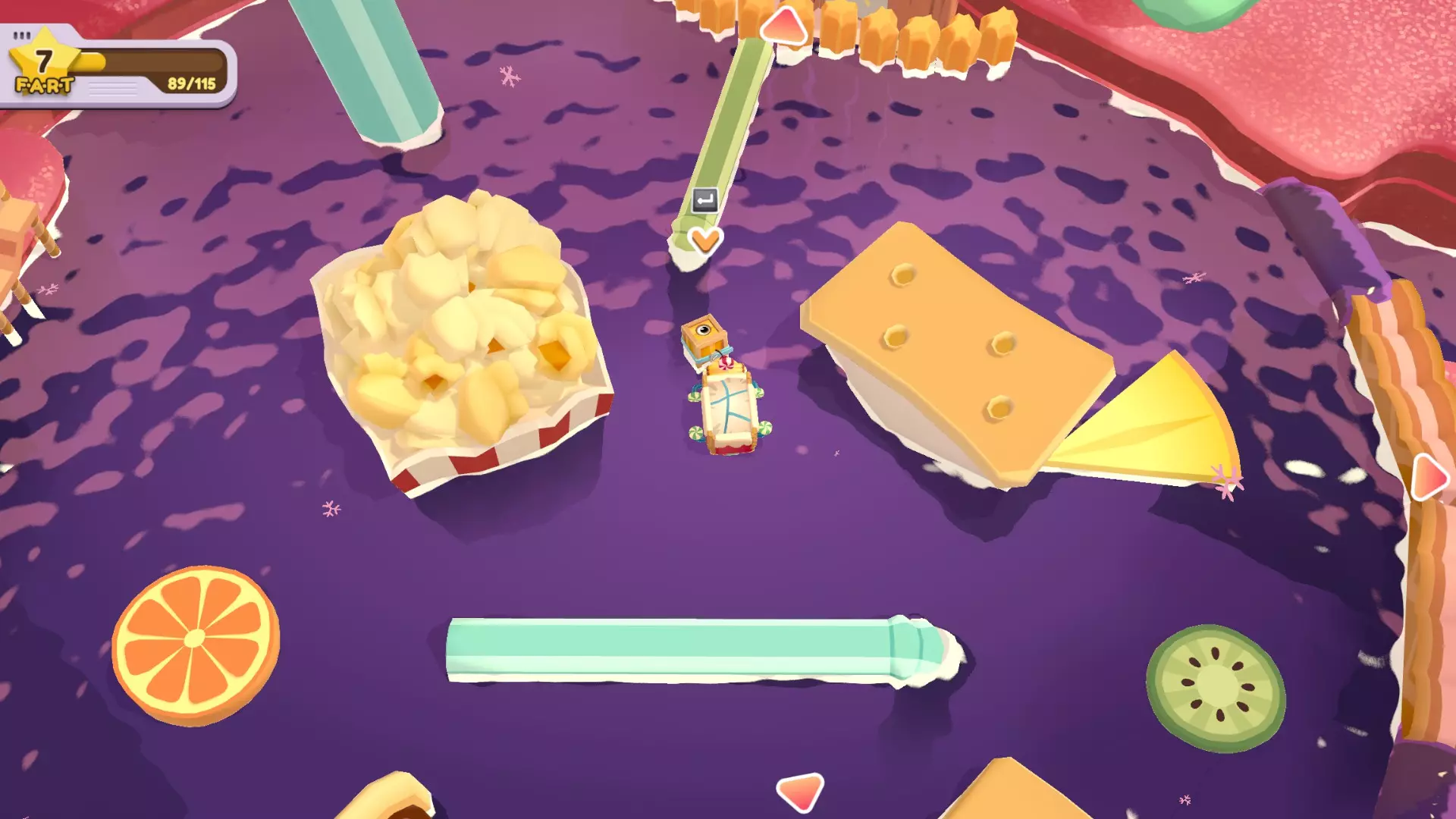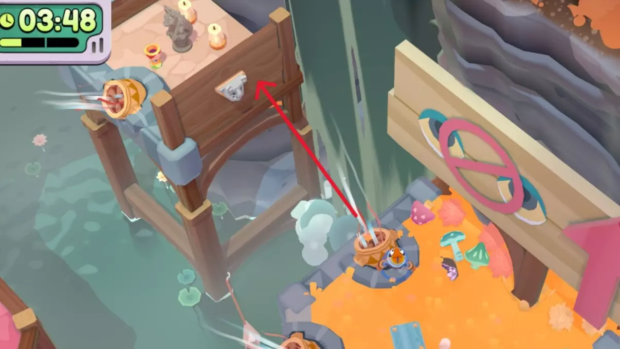 扔掉所有水果 挑食? 使用杠杆的次数少于6次 单人完成方法: 小贴士:如果一次性运不完所有东西,大件物品坐缆车,小件可以抛的统统抛到对岸去 直接抛容易失败,人跳到崖中再抛,死了无所谓,东西抛过去就行 使命必达!人货同航:拍打杠杆后人跳上车 第一次:把右边所有的东西运到左边去,人一起去左边。此时夹心饼门开,小熊软糖门关。 卸货,夹心饼投传送门。 第二次:缆车不放东西,人留在左边。此时夹心饼门关,小熊软糖门开。 小熊软糖投传送门。 第三次:所有宝石软糖和纸杯蛋糕运到右边,人到右。此时宝石软糖门开,纸杯蛋糕门关。 卸货,宝石软糖投传送门。 第四次:空车,人留右。此时宝石软糖门关,纸杯蛋糕门开。 完成。双人和搭档完成很简单。 优先送达所有小熊软糖。 因为挑战2要少于6次,刚好6次也会失败,和挑战2分开完成。 外观箱在右下角。