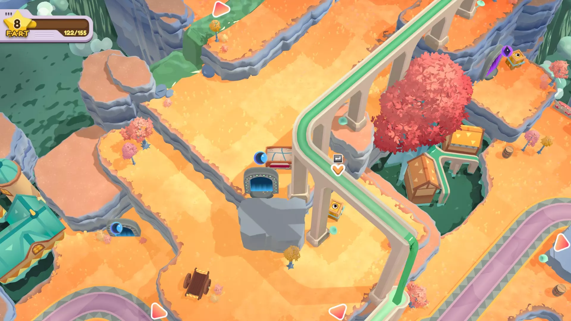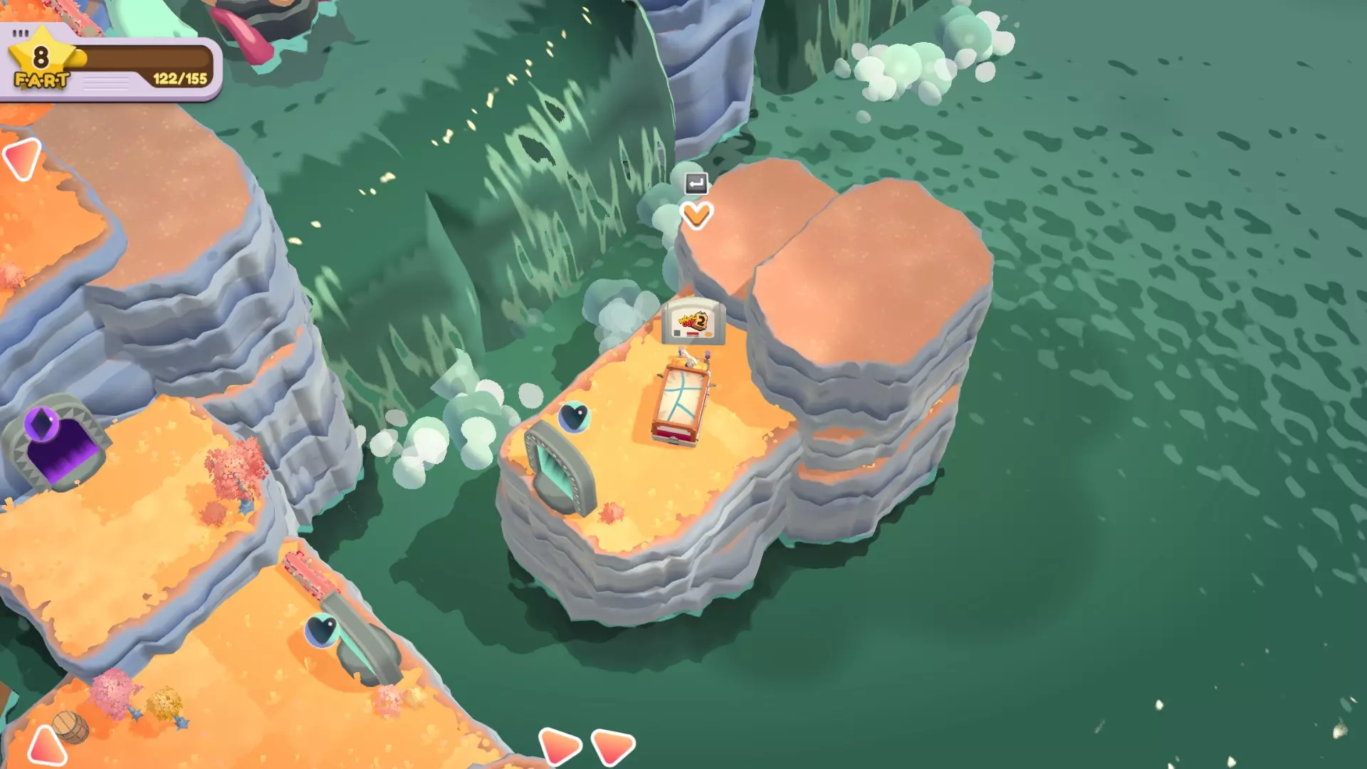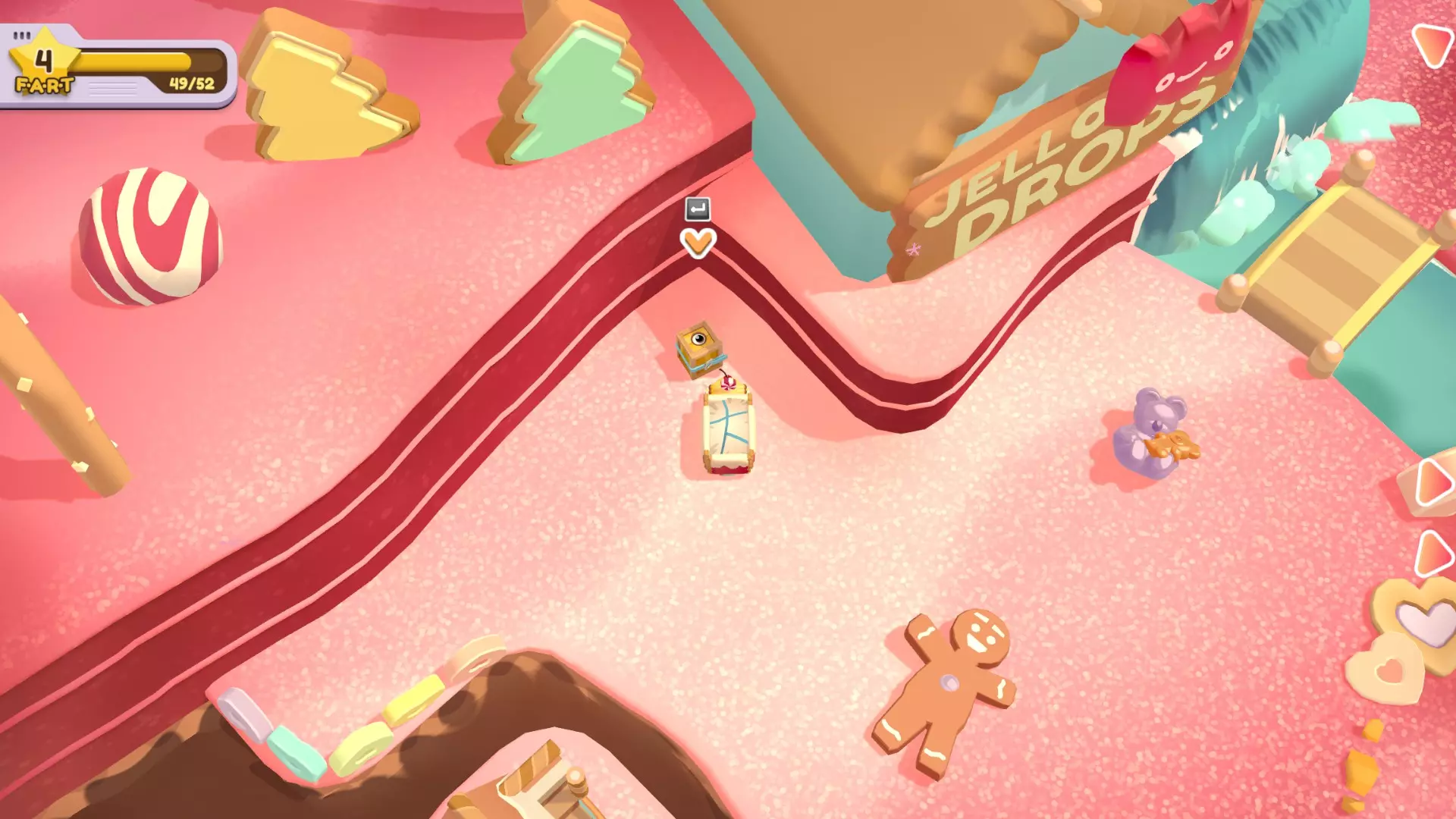 扔掉所有水果 挑食? 使用杠杆的次数少于6次 单人完成方法: 小贴士:如果一次性运不完所有东西,大件物品坐缆车,小件可以抛的统统抛到对岸去 直接抛容易失败,人跳到崖中再抛,死了无所谓,东西抛过去就行 使命必达!人货同航:拍打杠杆后人跳上车 第一次:把右边所有的东西运到左边去,人一起去左边。此时夹心饼门开,小熊软糖门关。 卸货,夹心饼投传送门。 第二次:缆车不放东西,人留在左边。此时夹心饼门关,小熊软糖门开。 小熊软糖投传送门。 第三次:所有宝石软糖和纸杯蛋糕运到右边,人到右。此时宝石软糖门开,纸杯蛋糕门关。 卸货,宝石软糖投传送门。 第四次:空车,人留右。此时宝石软糖门关,纸杯蛋糕门开。 完成。双人和搭档完成很简单。 优先送达所有小熊软糖。 因为挑战2要少于6次,刚好6次也会失败,和挑战2分开完成。 外观箱在右下角。