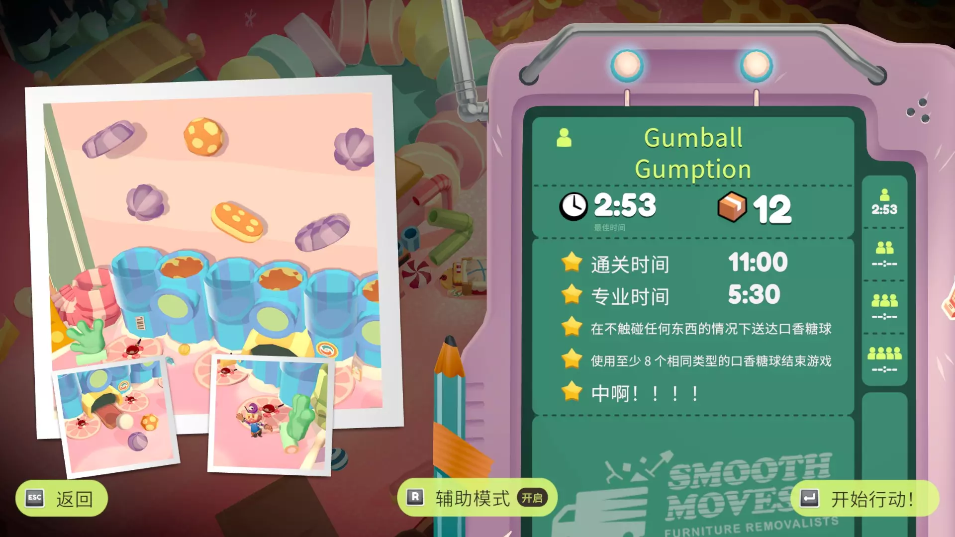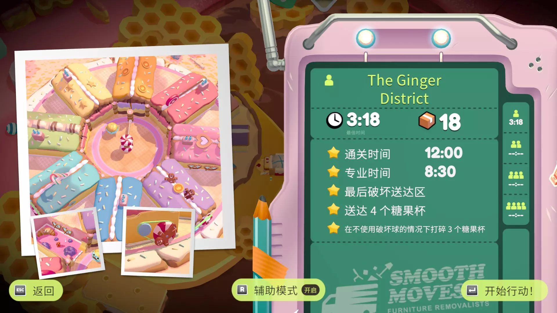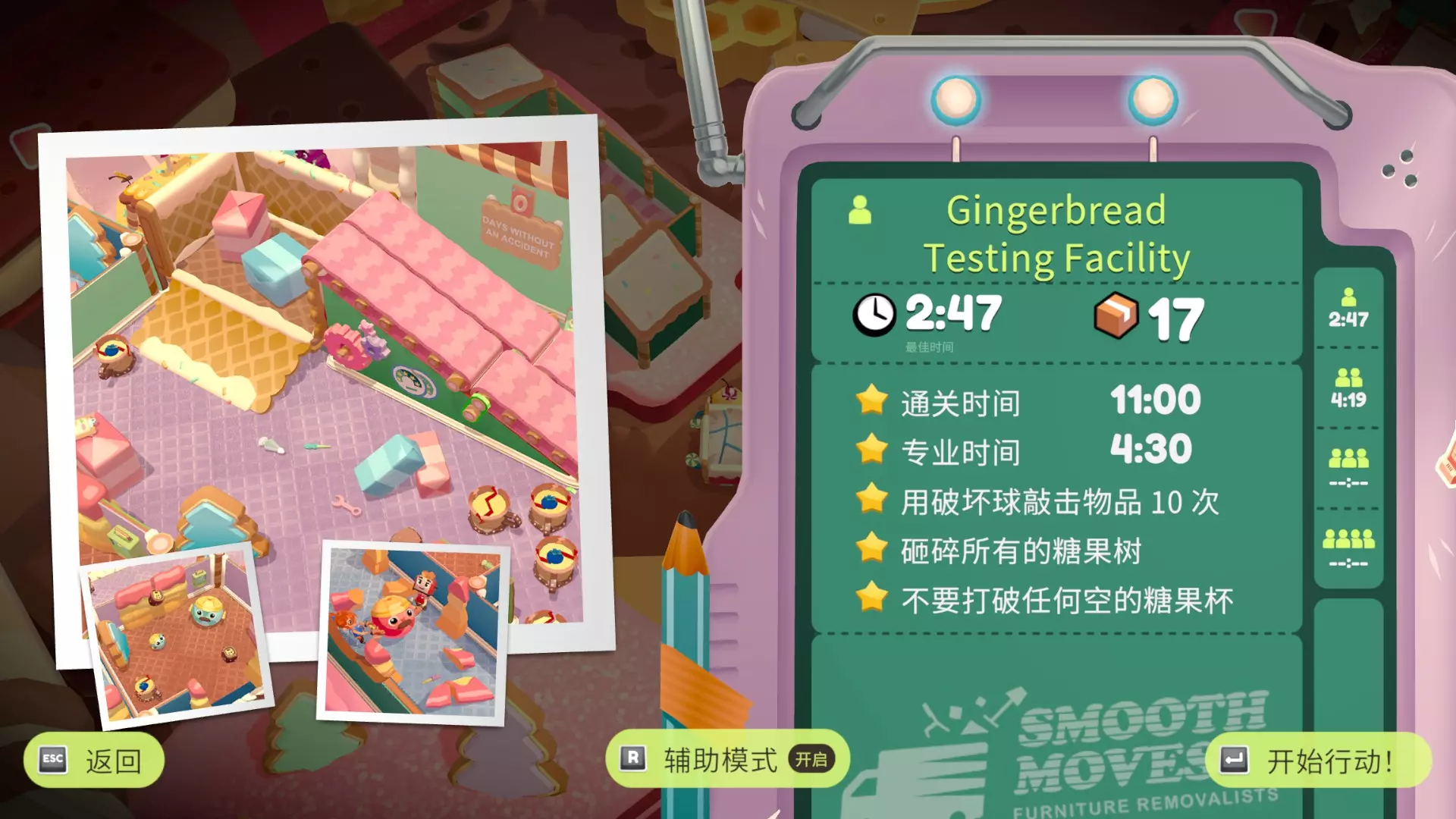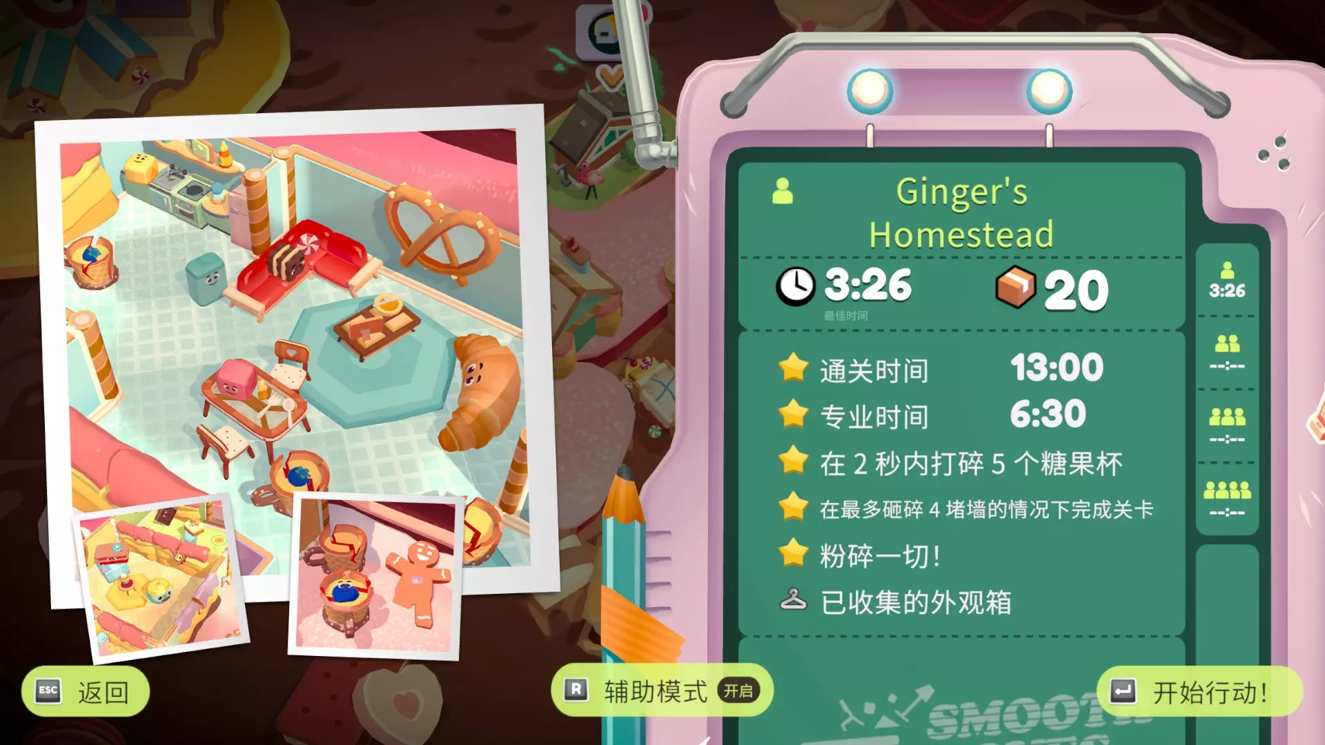 在最多砸碎4堵墙的情况下完成关卡 粉碎一切! 与上一个挑战冲突,需要再玩一遍,树、墙、糖果杯、玻璃,把能砸的都砸了 此关外观箱位于左上角