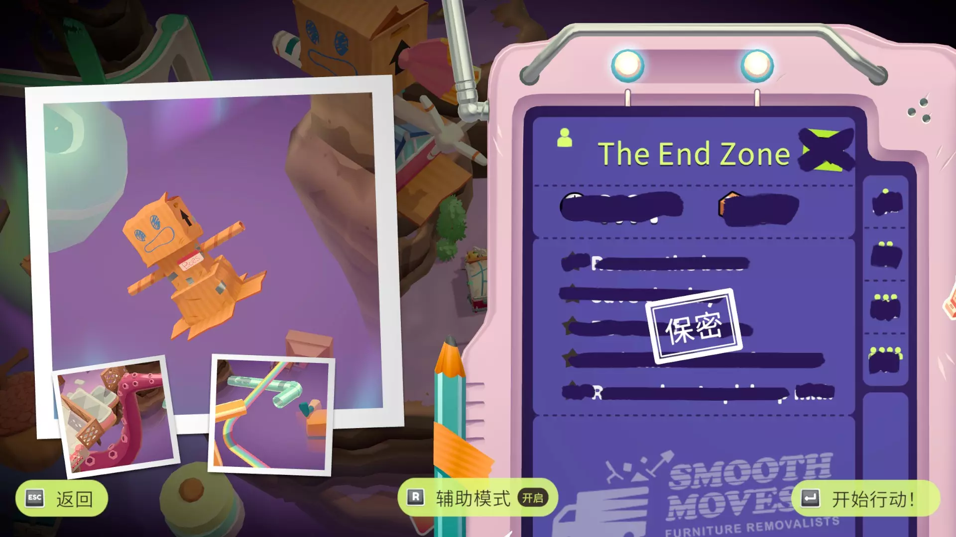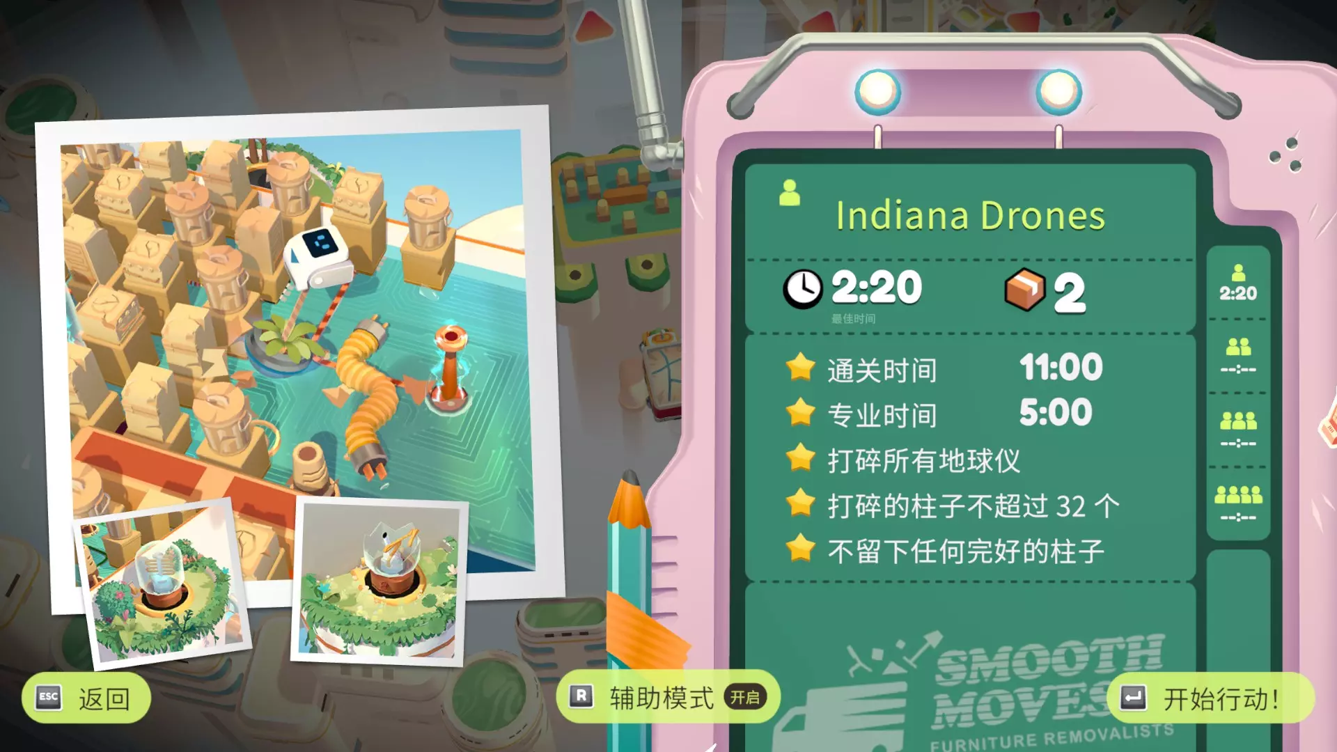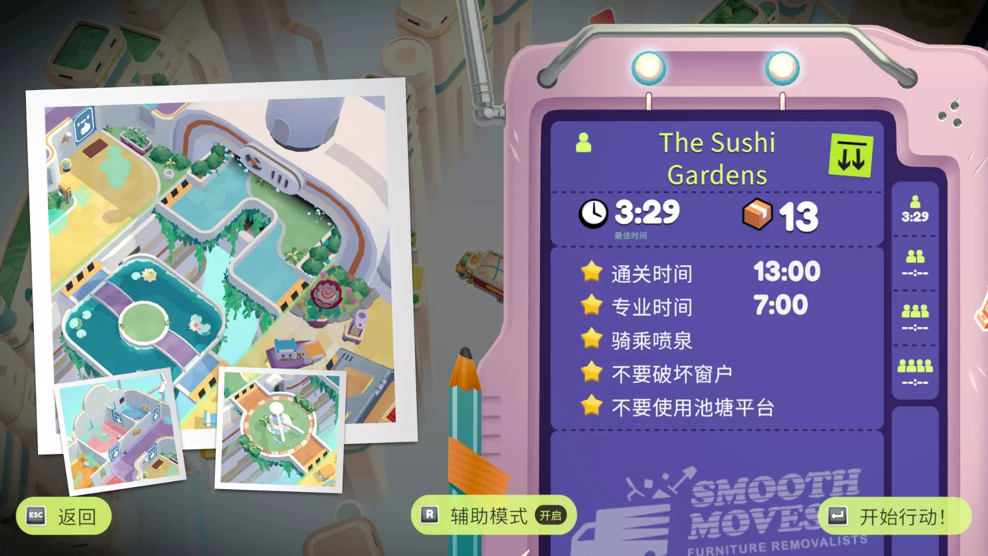 在不抓住花瓶的情况下把它扔到卡车上 用机器人撞飞 打碎所有屏幕 不要打碎任何易碎的盒子 用机器人撞下来,要及时接住 寿司花园