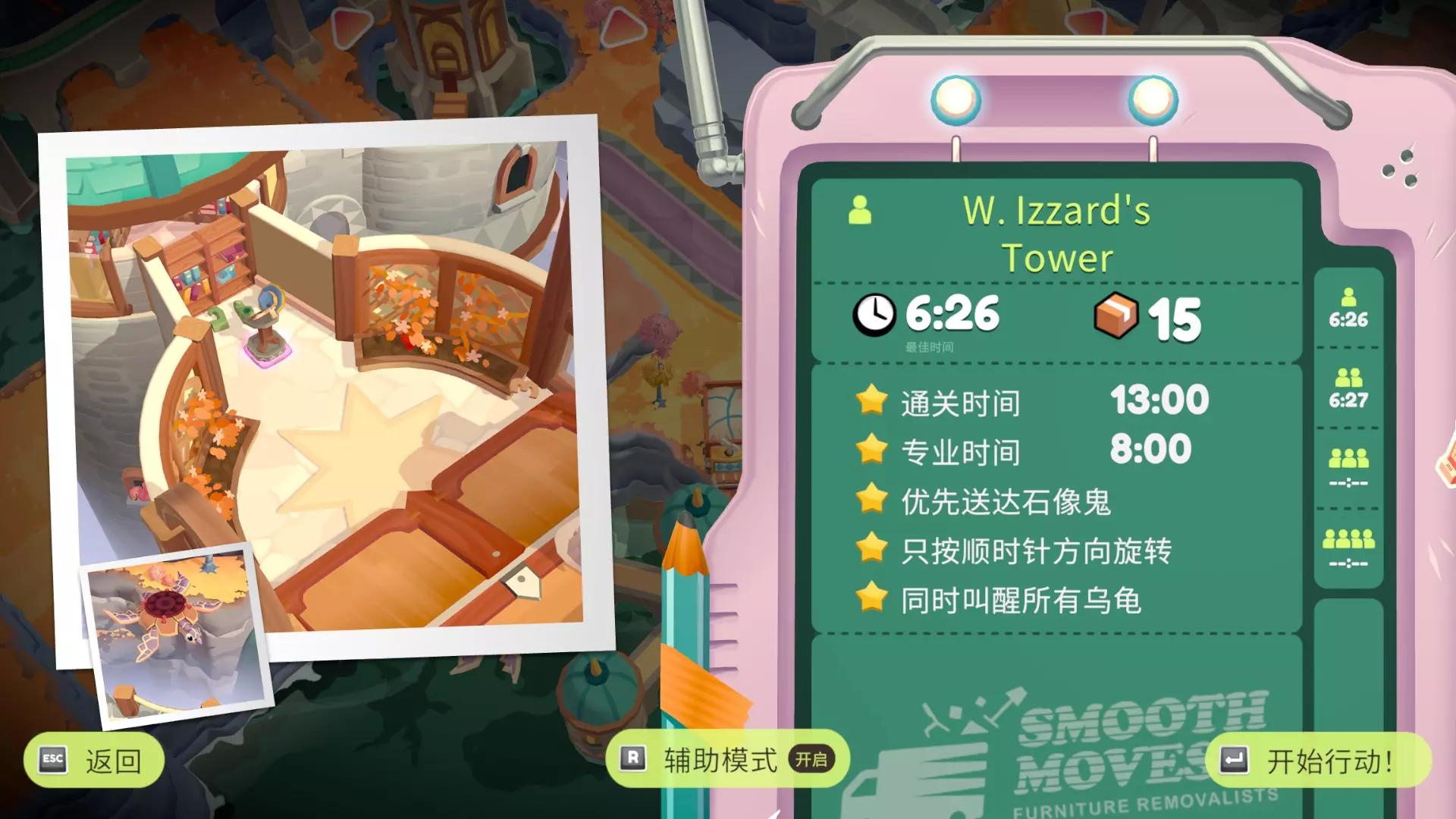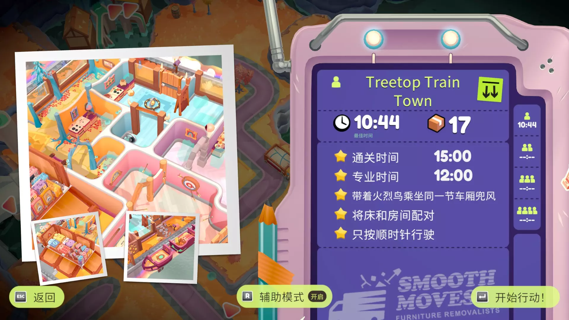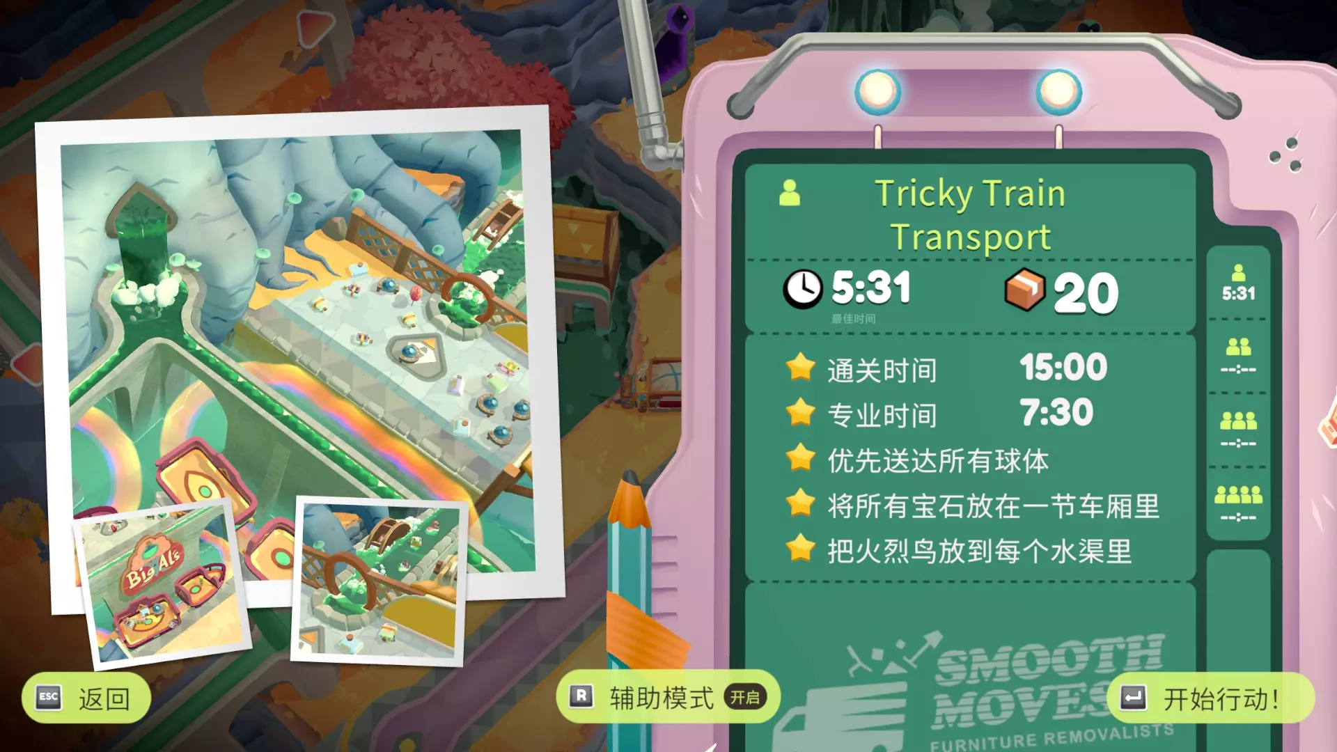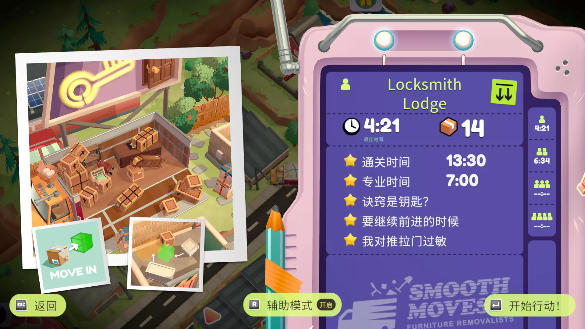 单人参考:由于每个门只能走一次,建议善用提示检查家具是否已搬空。从正方形门前往17平台,将家具全部运到8,可投掷的物品都扔到1,易碎品直接扔上车。跳到7,把家具扔到1,再从三角形门到18,将家具一路向下运送,路线为18→13→9→5→2→1,人留在2。从十字门到19,把家具运到15,人可选择跳到20(不跳也可以),之后人和家具前往15→10,家具送到6,人跳到11,踩11的梯子上16,接着人和家具经11→7(家具可直接扔到1)→3→1。从星星门到20→10(若之前没去20,这里记得运送家具),人和家具从10→6→2→1。从甲虫门到15→10,从月亮门到21,把家具扔到1,从黑桃门到13→1,最后装车离开。进入第二个传送门时,注意不要触底。橙色菱形→红心或红心→橙色菱形的路线均可选择。在35秒内通过所有传送门。我用了不同的方式来描述我的参考路线,都是同一条,请选择便于您理解的那一版: ①门+平台编号:正方形(1)→17→盾(12)→十字(2)→15→10→11→三角形(7)→13→菱形(9)→菱形(1)→红心(14)→星星(1)→甲虫(15)→甲虫(1)→月亮(10)→黑桃(21)→结束 ②门→方向+动作:正方形→浮空平台→左下→盾→下→十字→右下→下→右跳→右下→三角形→下→下→菱形→菱形→红心→下→星星→下→甲虫→甲虫→下→月亮→黑桃→结束 ③星标是起点