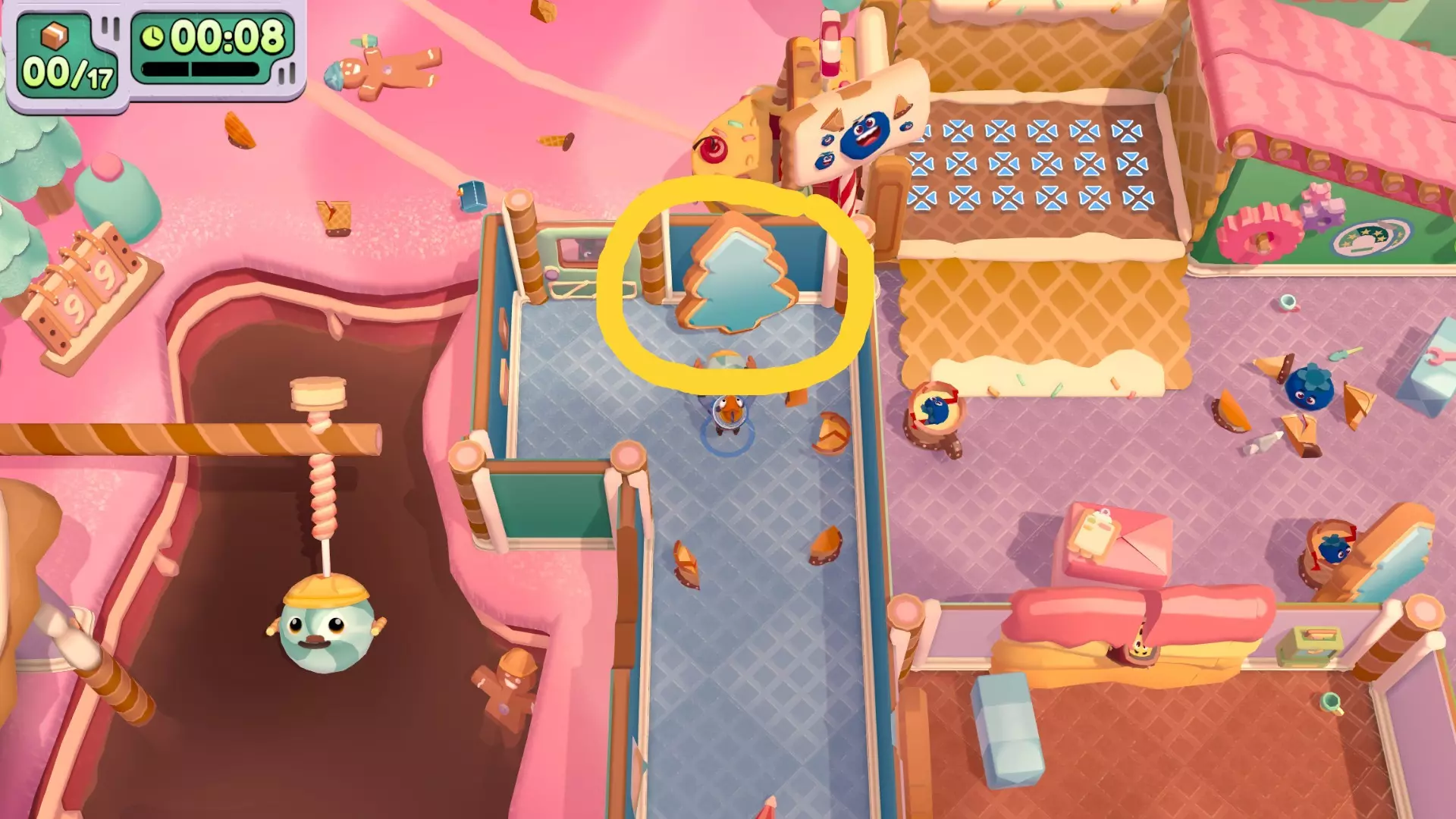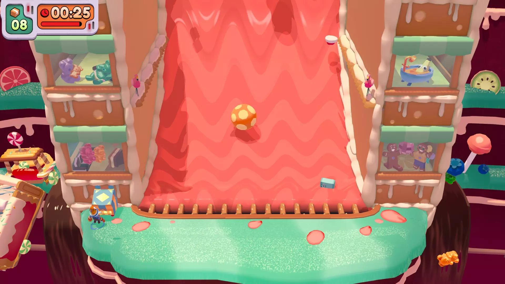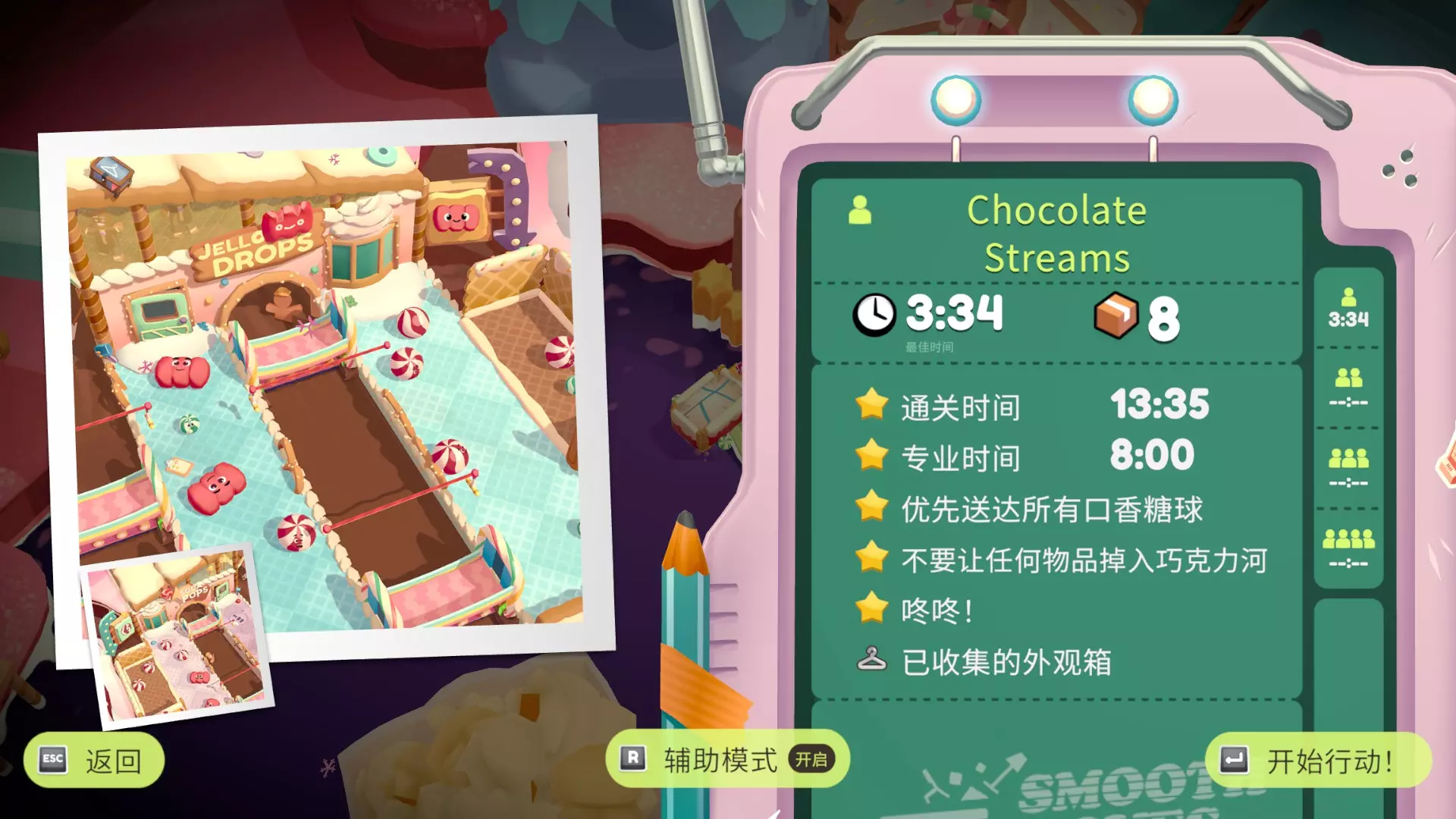 优先送达所有口香糖球 不要让任何物品掉入巧克力河 咚咚! 把两扇门都关上