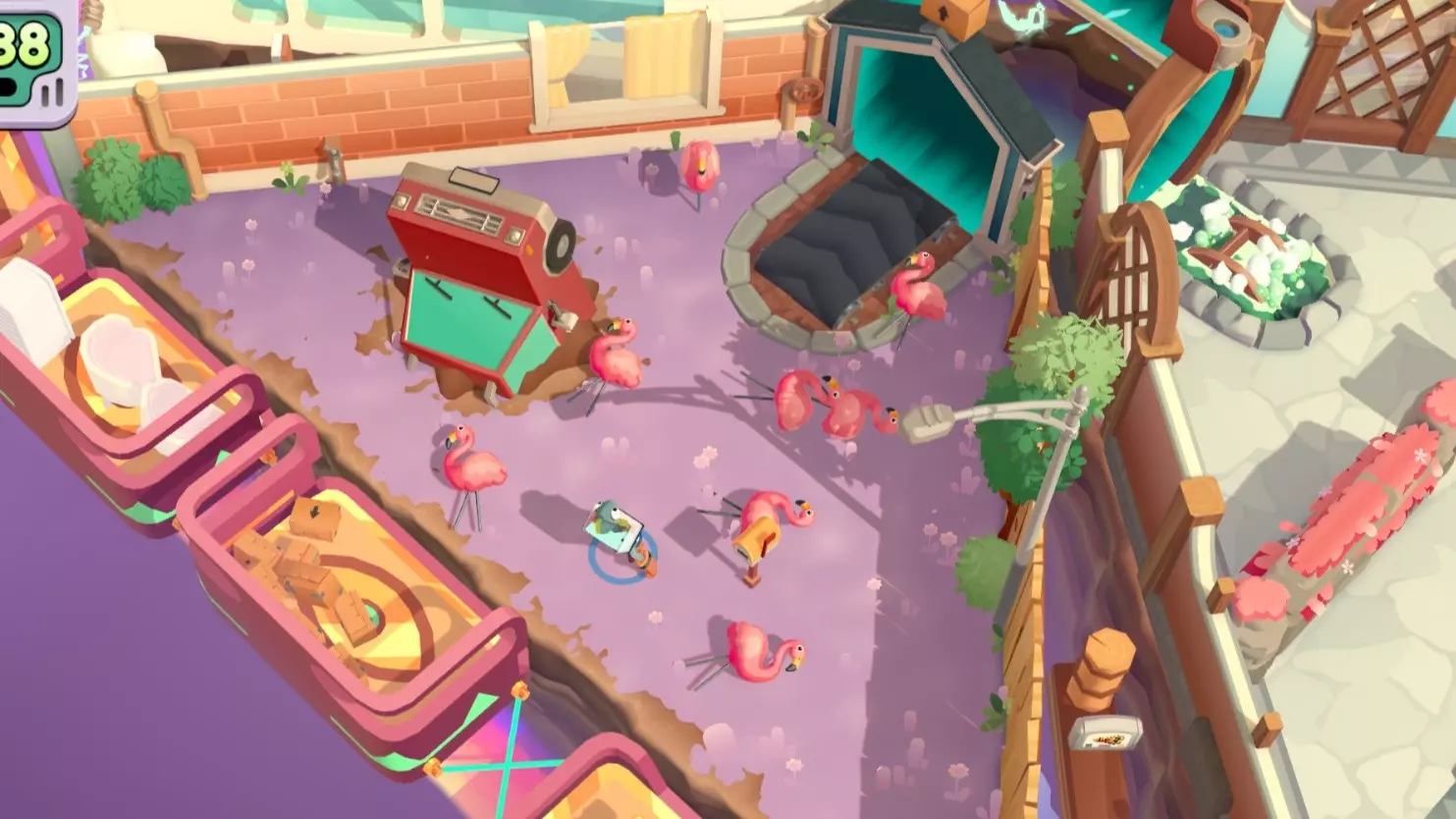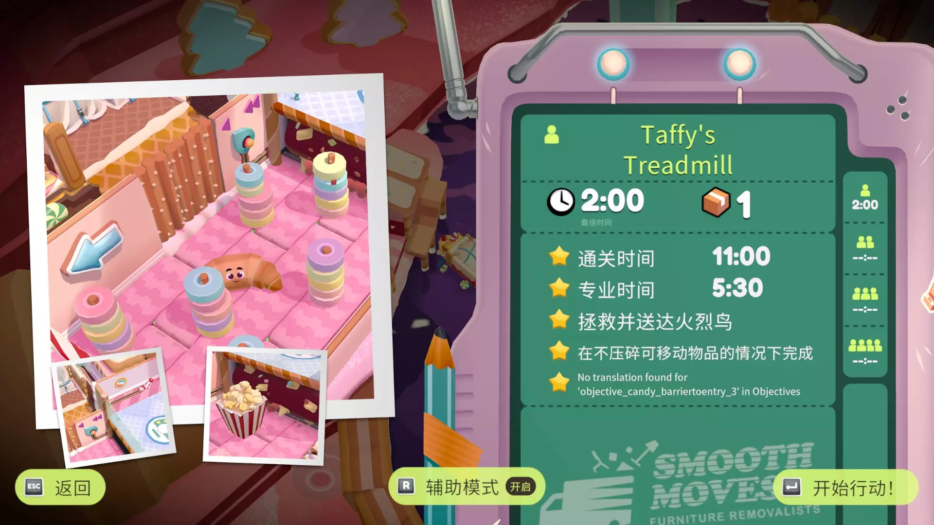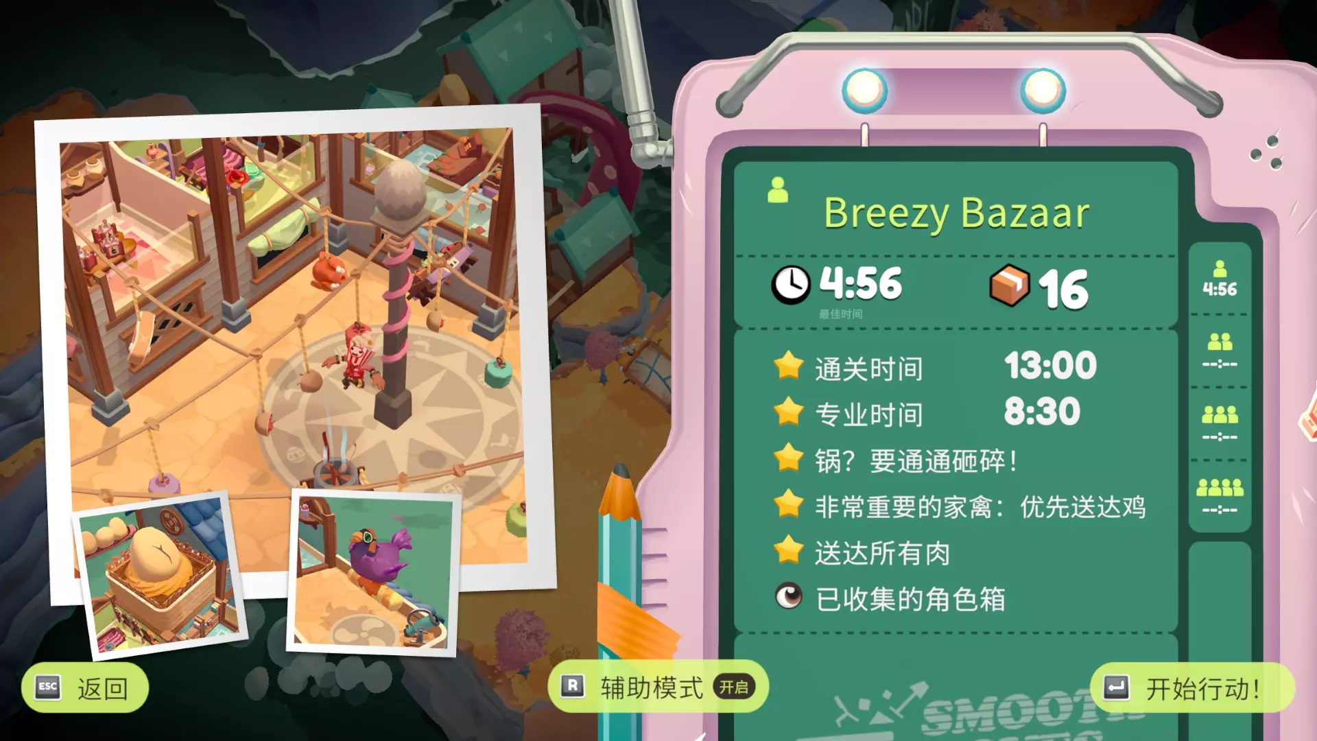 拯救并送达火烈鸟 火烈鸟出现后丢掉手中物品,传送带就会停下 在不压碎可移动物品的情况下完成搬运 以快速模式激活状态完成搬运 开始前拍一下这个杆来调节速度