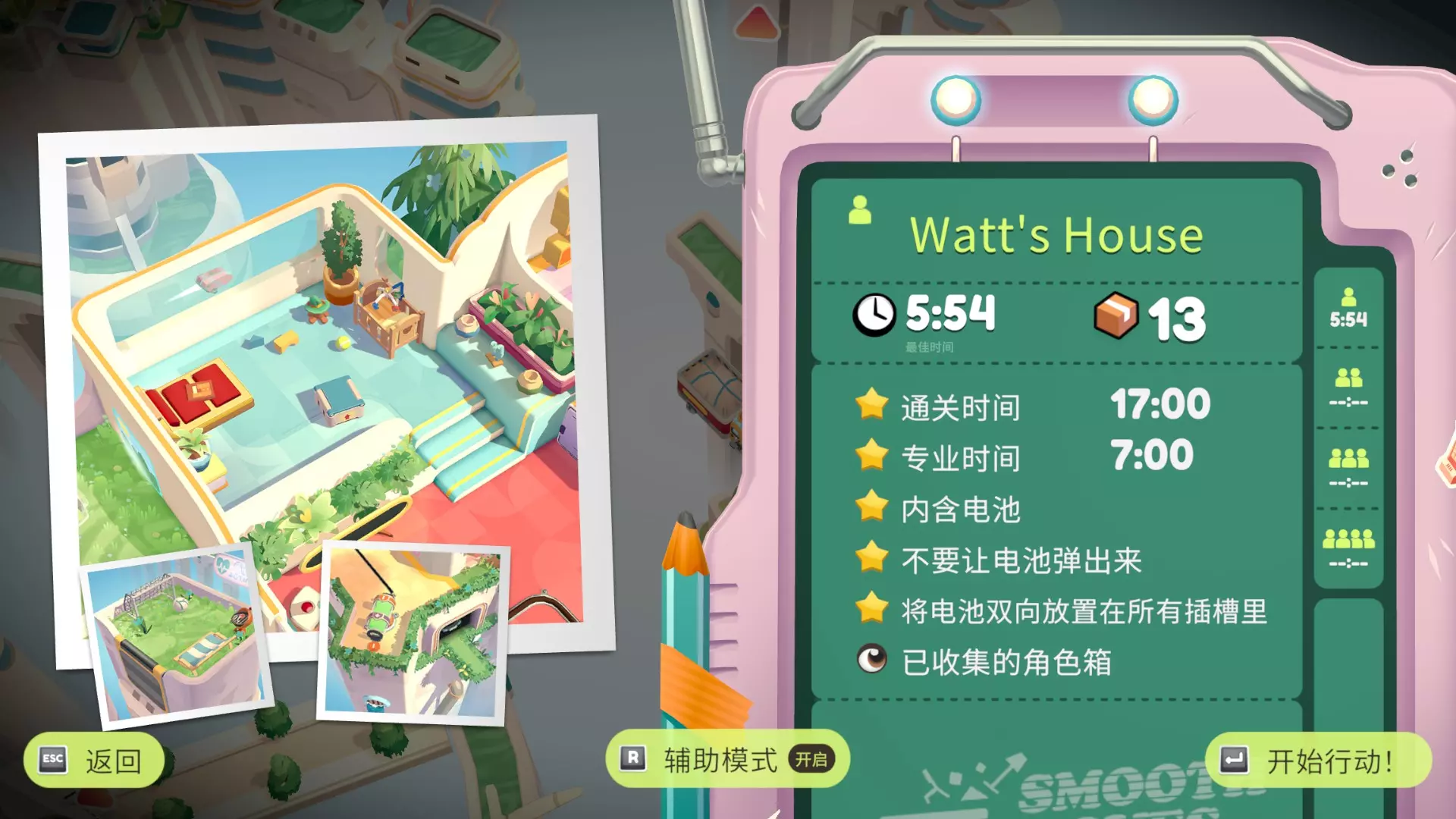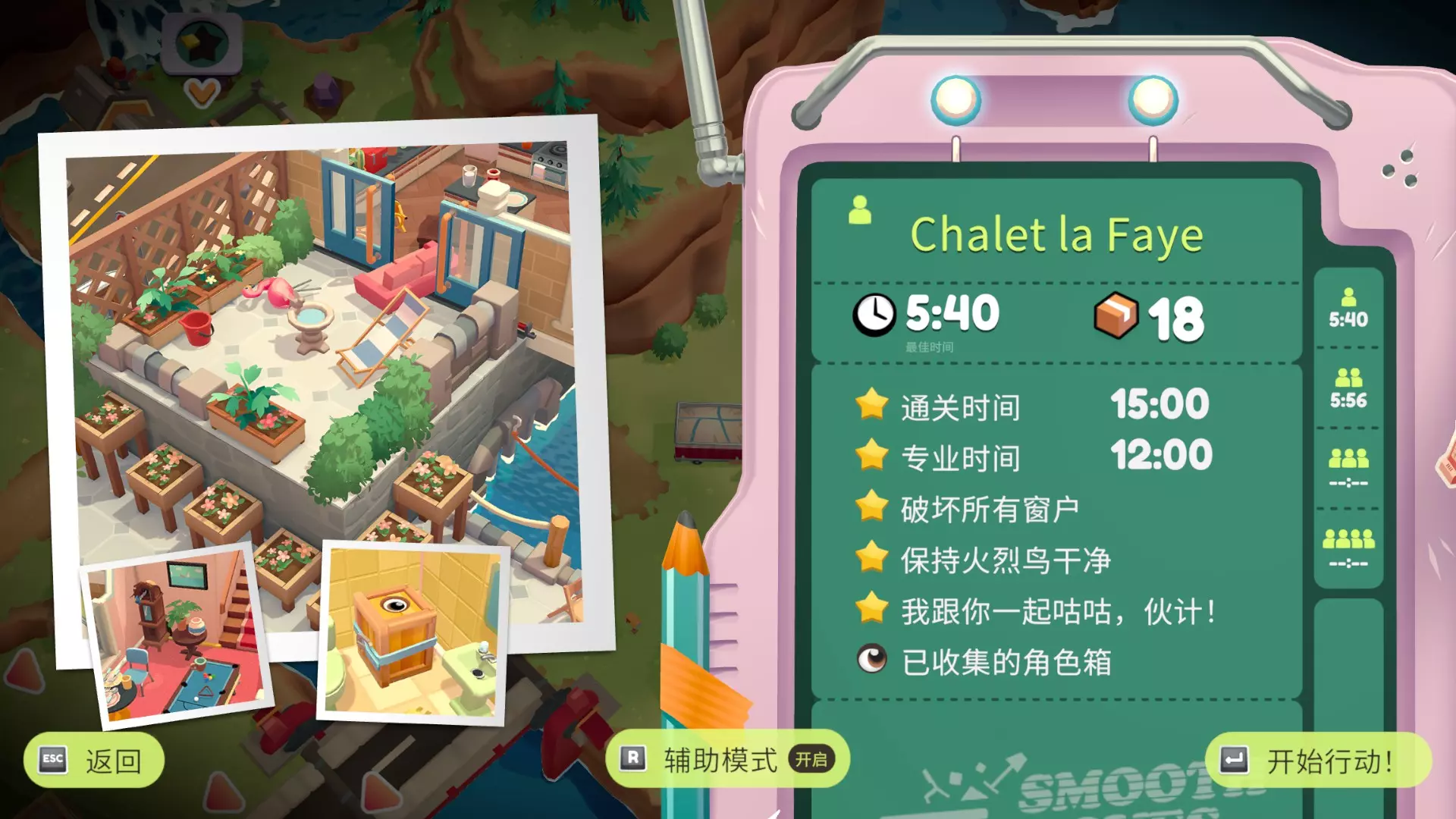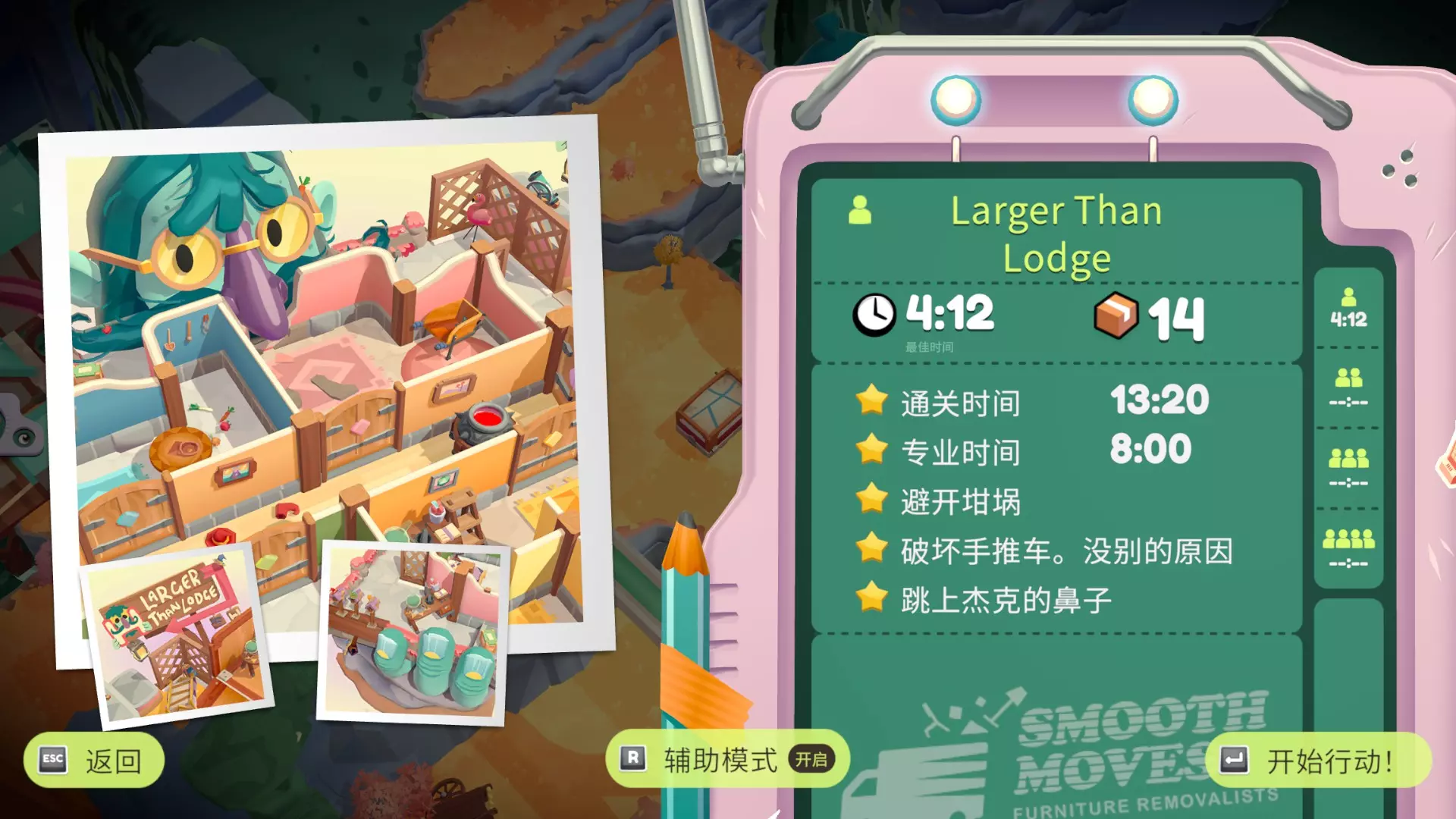 今天发现整个游戏有且只有一篇英文成就指南(震惊) 因为游戏翻译问题有的挑战看起来很有迷惑性,想看简中的可以参考一下这篇,大部分挑战是帖主单人做的所以开了辅助模式,挑战时间比较宽松,关卡顺序不一定准,仅供参考,有误可留言基本都会看 部分挑战达成条件参考来源:【B站up活跃度低的屠夫】 小tips:挑战可以分次完成 序章·达包镇 Billie's Bungalow