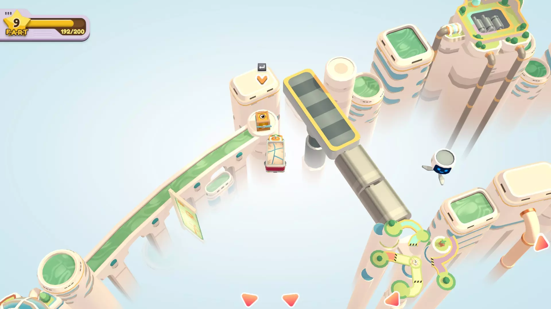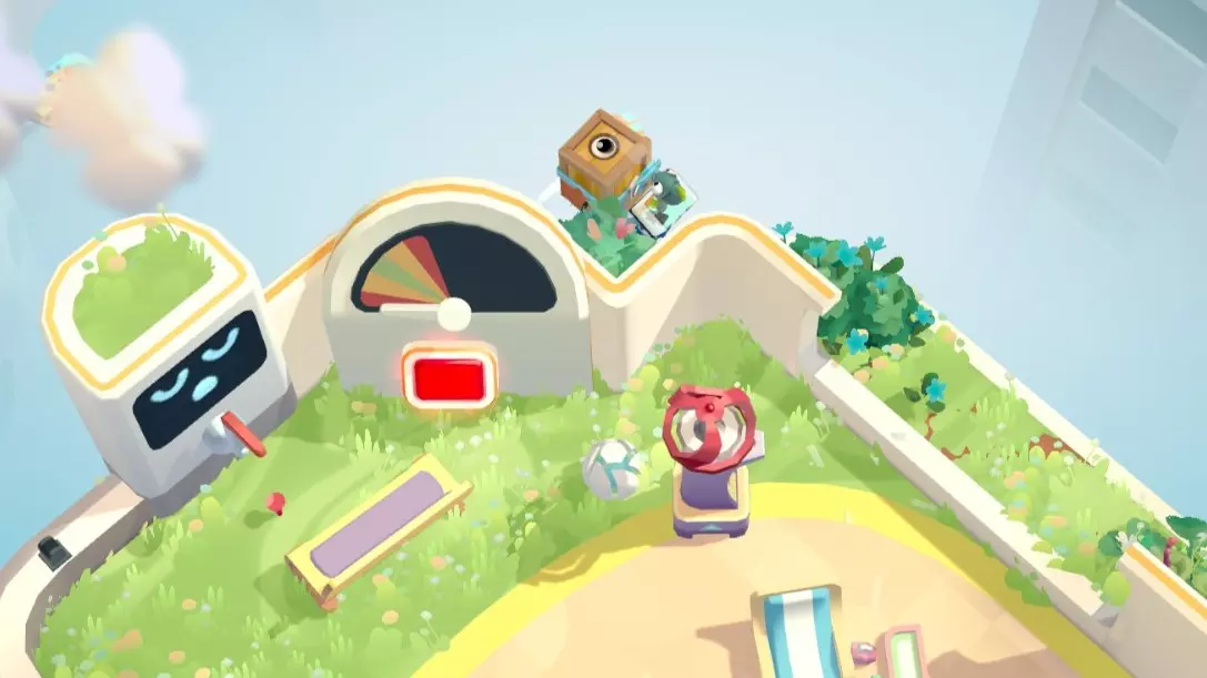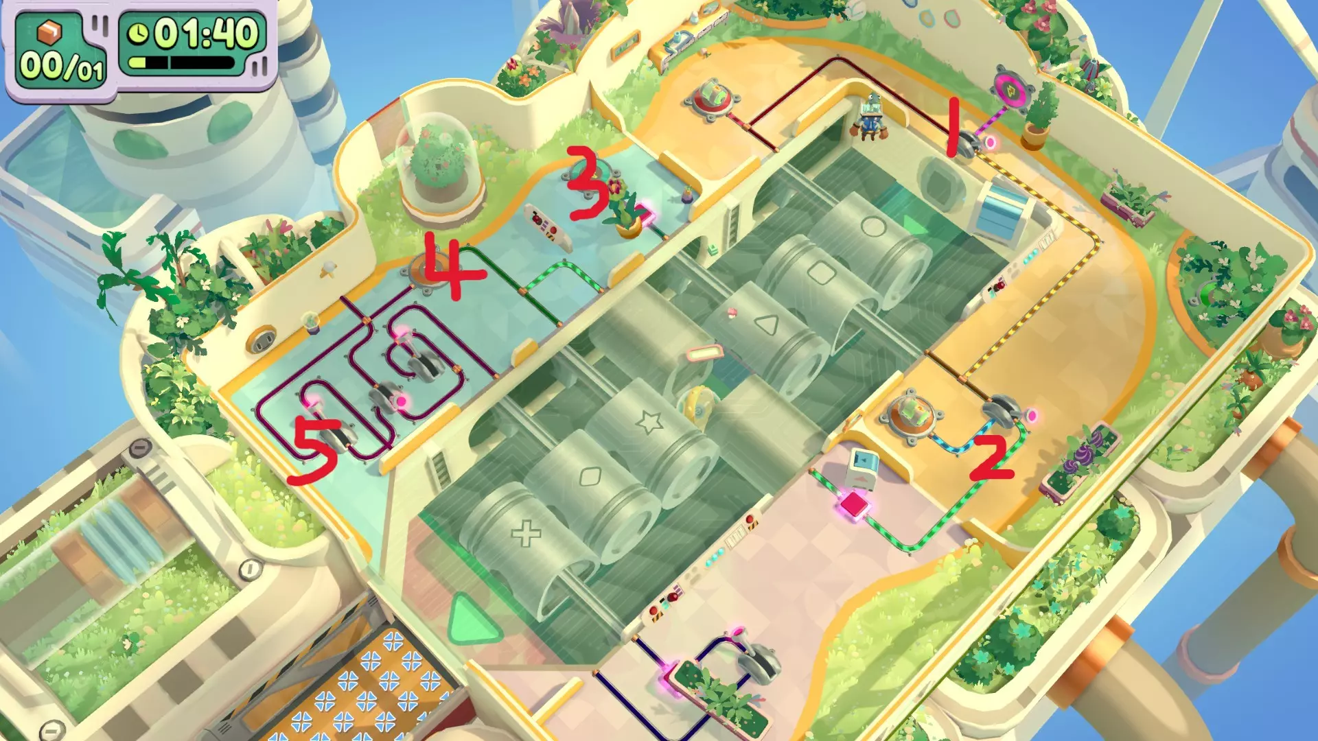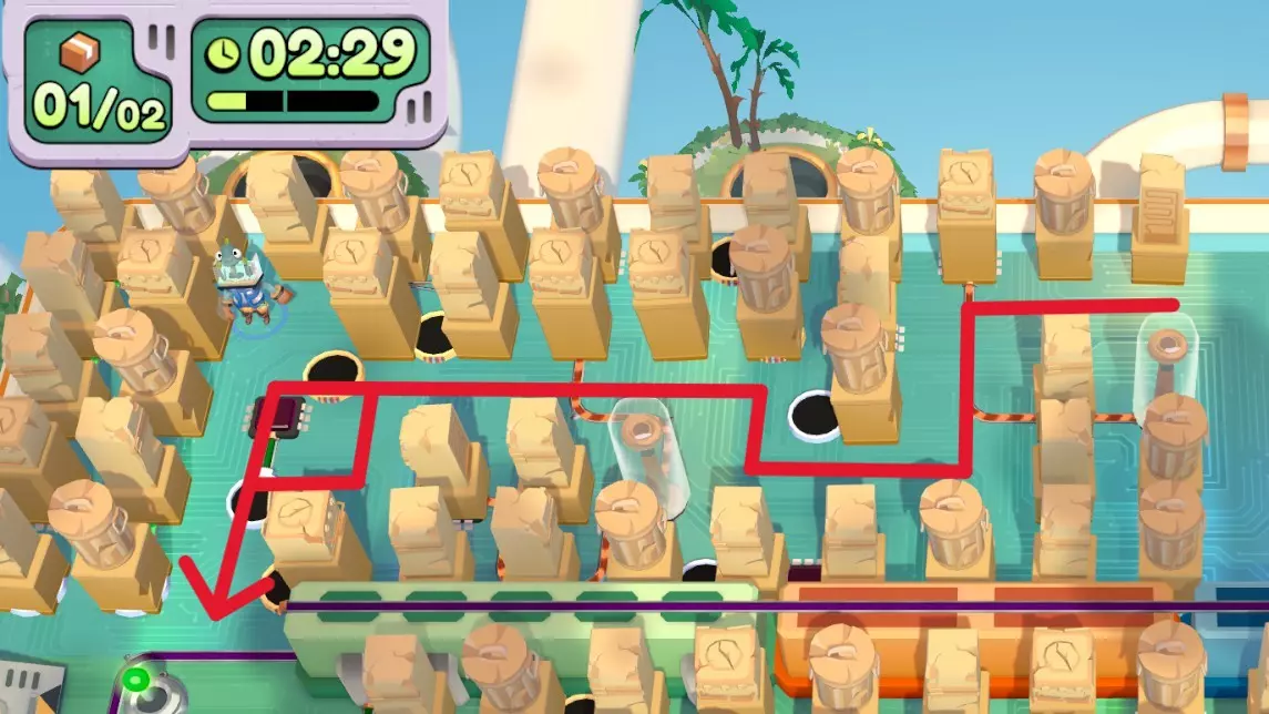 在不进行触碰的情况下送达4件物品 让机器人送,它接触不到的可以踢到它面前或者把它抓走,间接接触不算接触 用高尔夫发球机送达一件物品 指针到绿色的时候物品正好落到车上 角色箱在这个角落