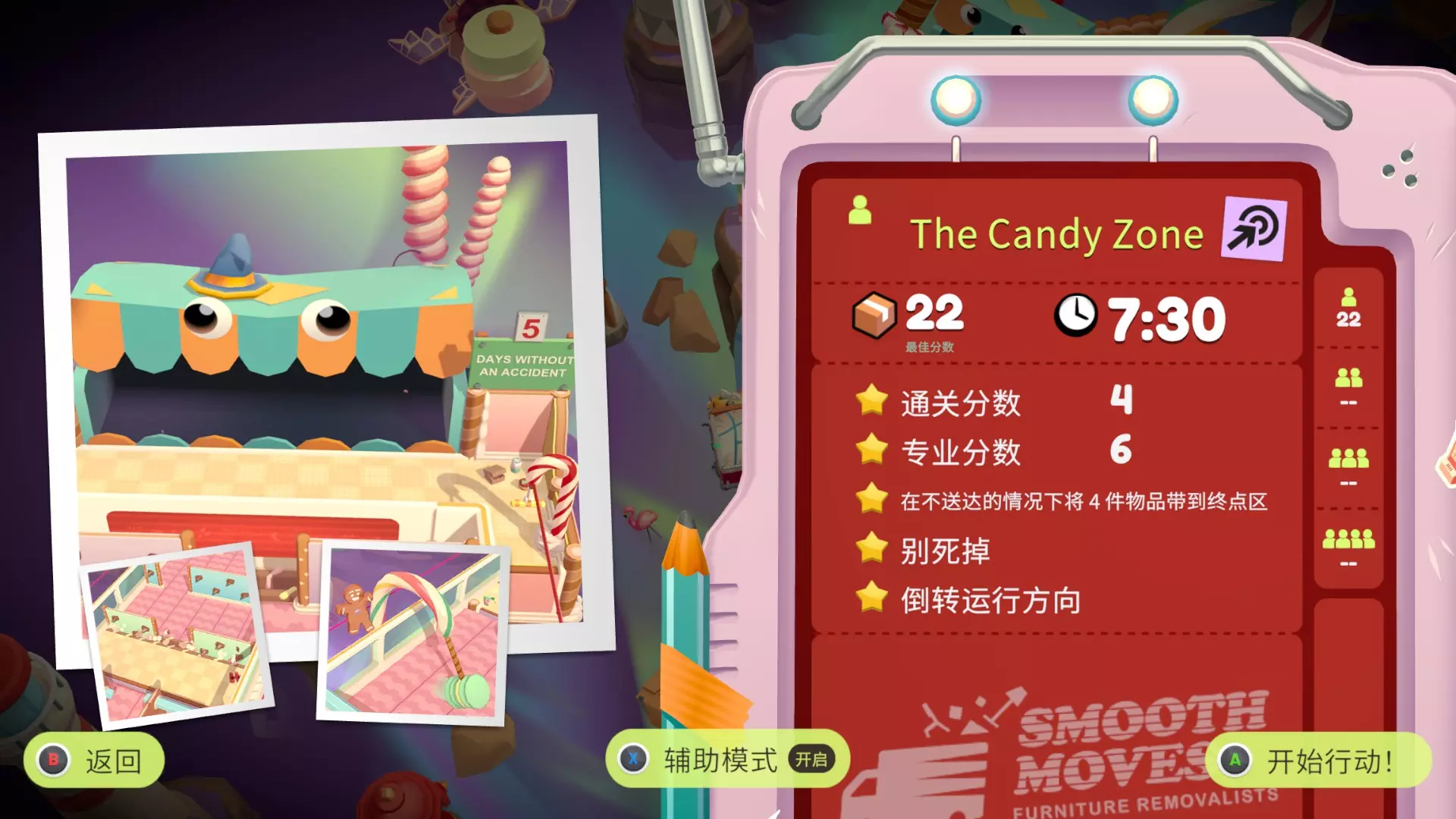 不要被果奶糖炸弹击中 炸弹即将爆炸时躲开 分拣5台游戏机 游戏机样式如图所示,放置到任意传送带上即可