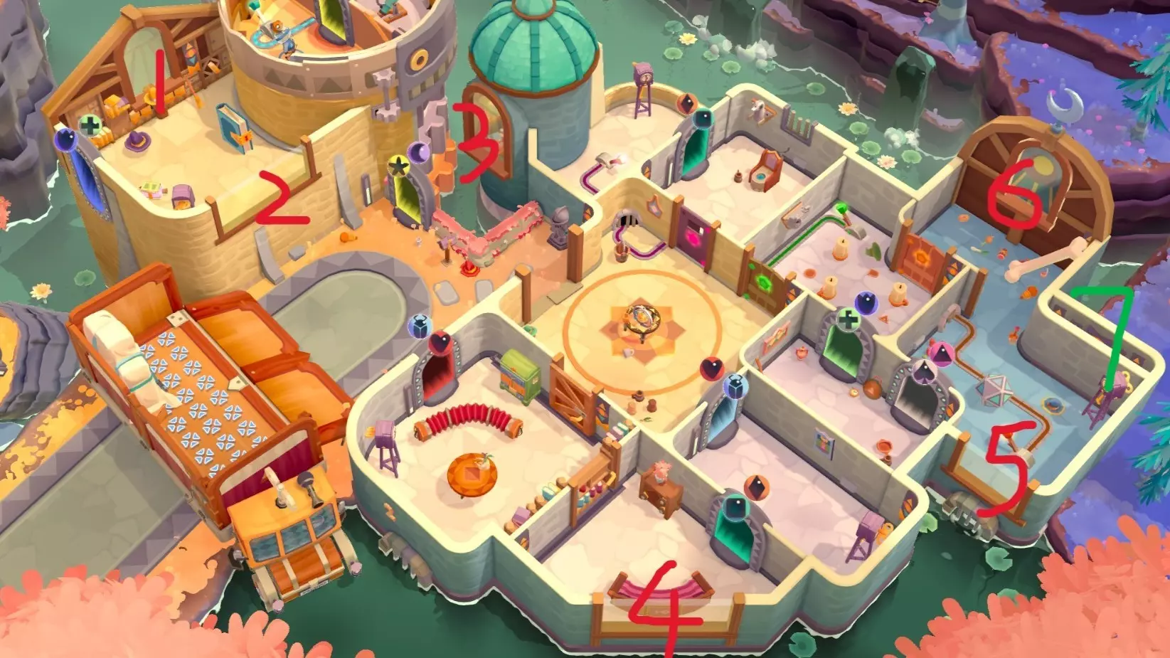 优先送达所有球体 将所有宝石放在一节车厢里 把火烈鸟放到每个水渠里 共三只,对应一条水渠一只 神秘大厦
