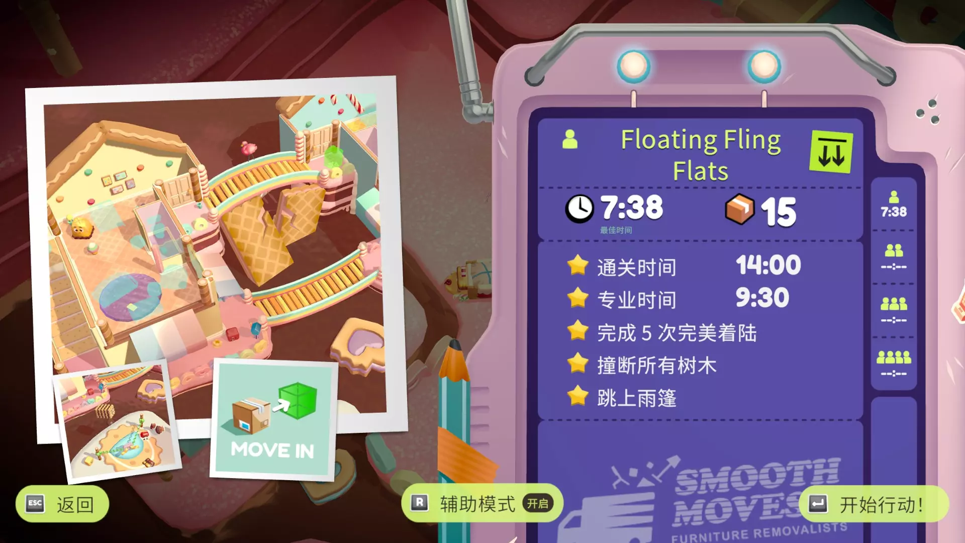 完成5次完美着陆 用弹弓将家具发射到准确位置 撞断所有树木 左右各有两棵树,使用两人份的大型家具可以撞断 跳上雨篷 方形的物体是雨篷