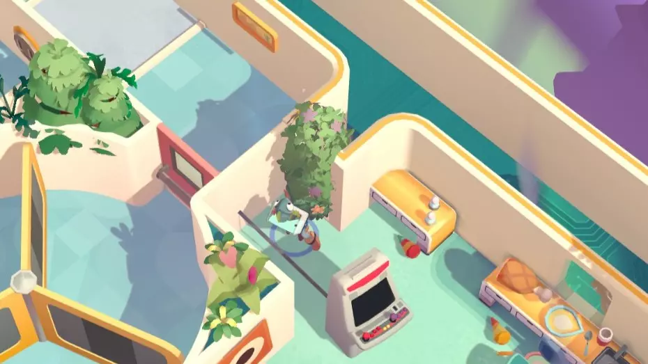 游戏机后的绿植带可以穿过去,街机厅卡带在走廊尽头