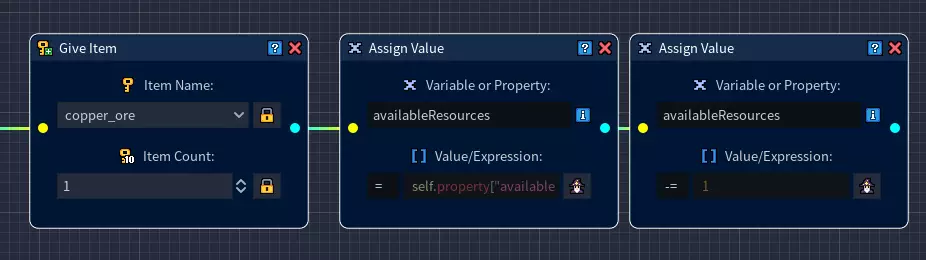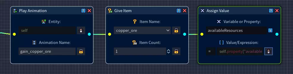 返回脚本编辑器后,在网格中添加【给予物品】节点,并将其与【播放动画】节点相连。 从下拉列表中选择物品名称,然后选择你的资源物品(在我们的示例中为铜矿石)。 将物品数量设置为1。 步骤10:既然我们已经给了玩家一些资源,我们还必须确保剩余可采集的资源减少。 要实现这一点,我们首先在网格中添加【赋值】节点。 像往常一样,将此节点与前一个节点(即【给予物品】节点)相连。 我们将创建一个名为availableResources的变量,用于存储可用资源的数量,并在之后使用该变量进行计算。 我们将给这个变量赋予与步骤1中创建的【自身属性】availableResources相同的名称。打开变量表达式生成器。 选择【自身属性】作为变量类型,并输入属性名称【availableResources】。 现在我们获取到了步骤1中为铜矿石创建的【自身属性】的值。