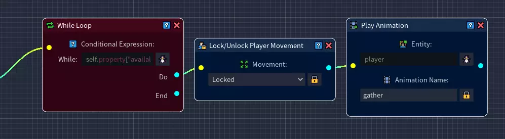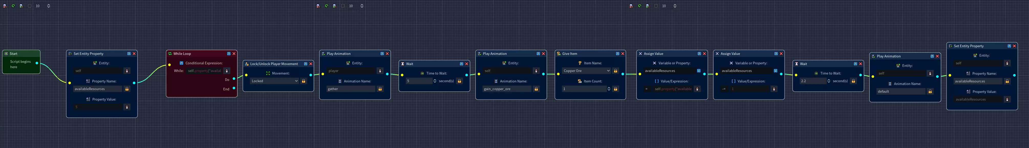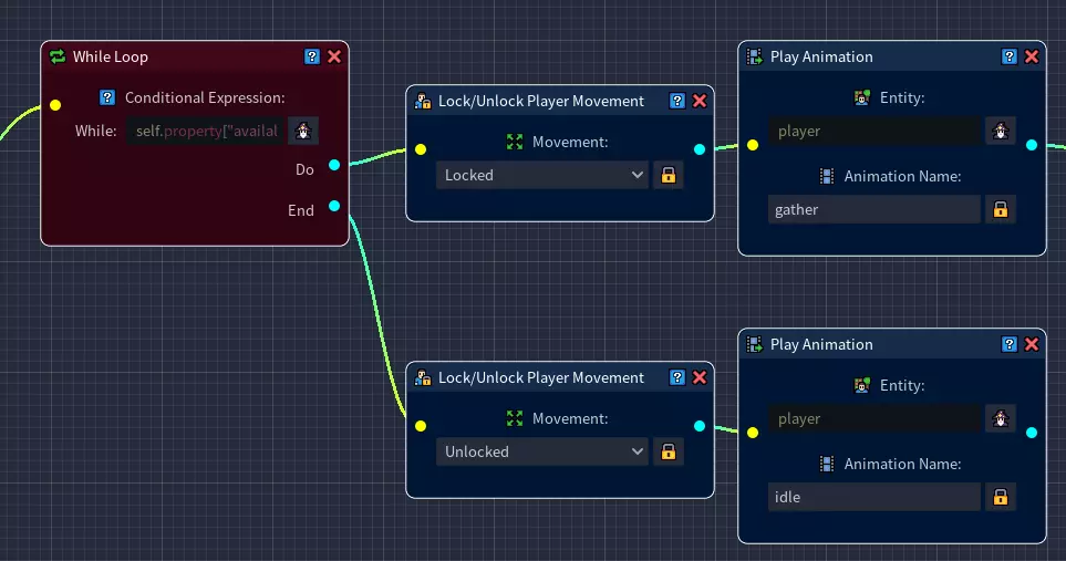 如果你保存所有更改并使用快速游玩测试游戏,应该会看到角色现在每隔几秒也会获得一些铜矿,直到从岩石中采集完所有5个铜矿为止。 一个小问题是玩家角色仍在播放采集动画。 当我们采集完所有资源时能收到通知会更好。 下一步我们将通过使用循环节点的结束连接器来解决这个问题。 创建脚本(第三部分) 步骤16:导航至脚本编辑器,找到我们之前创建的循环节点。While循环的【Do】连接器已处理完毕,现在我们将专注于【End】连接器,该连接器仅在条件表达式的条件满足后执行。