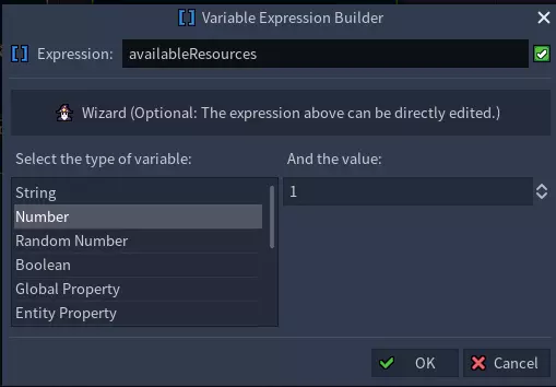 将【availableResources】作为属性名称输入。 打开变量表达式生成器,并选择数字作为变量类型。 在变量表达式生成器的表达式字段中,输入我们的变量【availableResources】的名称。 值字段并不重要,因为该值将被我们的变量【availableResources】的值覆盖。 步骤15:现在我们已完成While循环的Do连接器设置。 你的脚本编辑器中的网格应如下所示: