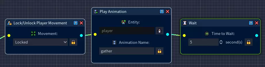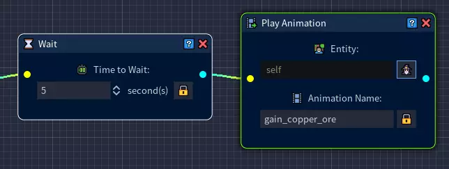 我们希望玩家在与铜矿互动时,播放我们为其创建的采集动画。 在网格中添加一个【播放动画】节点,并将其连接到【锁定/解锁玩家移动】节点。 打开【播放动画】节点的实体表达式生成器,选择【玩家】。 现在输入对应的动画名称。该名称必须与玩家角色的采集动画名称完全一致! 步骤5:为确保玩家不会一次性获得所有资源,我们将一个【等待】节点拖到网格上,并将时间设置为5秒。这将在每次获得矿石之间产生一定的延迟。