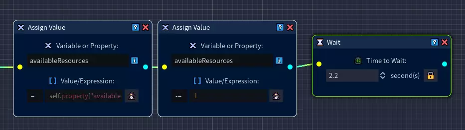 步骤11:在网格中添加另一个【赋值】节点,并将其连接到上一个【赋值】节点。 将变量设为availableResources。 左键点击等号(=),将其更改为减号(-=)。 打开【变量表达式生成器】,选择变量类型为【数字】,并输入值1。 现在可用资源数量已更新,并存储在availableResources变量中。 稍后我们仍需将此值存储回自身属性availableResources中(参见步骤14)。