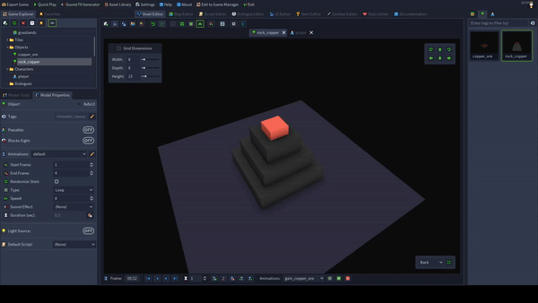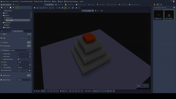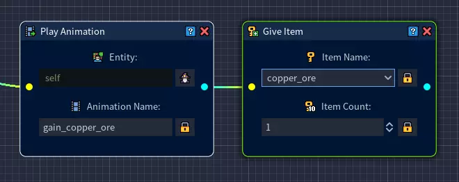 要是能有一些图形提示来显示玩家何时获得矿石就好了。 这就是我创建“获得铜矿”动画的原因。 在网格中添加一个【播放动画】节点,然后打开【实体表达式生成器】。 选择【自身】并点击确定。 现在输入对应的【动画名称】。这个名称必须与你的铜矿物体的采集动画名称相同! 步骤7:如果我们现在启动游戏,会看到玩家角色可以与铜矿互动,会显示采集动画,铜矿也会显示其采集动画,但我们还不会获得任何资源。这部分我们将在下一步处理,但首先我们应该确保到目前为止项目运行正常。保存当前脚本并返回地图编辑器。 选择编辑工具(F2)。 现在选择铜矿岩石并导航至实体属性标签页。 为该实体添加你的脚本并保存地图。 确保已配置启动脚本! 如果现在通过快速游玩测试游戏,你应该会看到类似的效果。