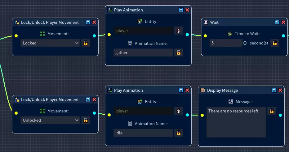 本指南到此结束。 现在如果我们测试游戏,玩家角色会回到待机动画状态,同时会显示一条消息,提示已没有可采集的资源。