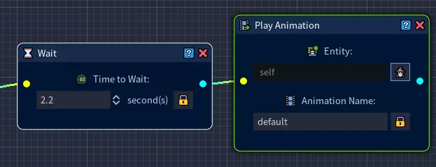 第12步:我们希望铜矿石在采集到一块铜矿石后,采集动画播放完毕时能再次播放铜矿石的闲置动画。由于动画需要一定时间完成,我们首先要在网格中添加一个等待节点,并设置大约2秒的等待时间。确保像往常一样将此节点与前一个节点连接起来。
