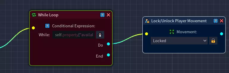 由于我们不希望玩家在挖矿时离开却仍能获取资源,所以在挖矿过程中会锁定玩家移动。 在网格中添加【锁定/解锁玩家移动】节点,并将移动设置为【锁定】状态。 确保此节点连接到【While循环】节点的【Do】接口。 步骤4