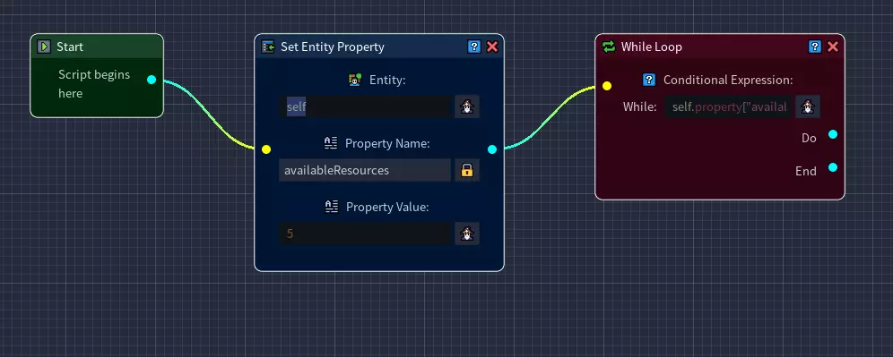 现在从可用逻辑选项卡中选择【循环】并将其拖到网格上。 将【循环】节点连接到【设置实体属性】节点。 打开【循环】的条件表达式生成器。 对于要检查的元素,选择【自身属性】。 对于运算符,选择【大于】。 要检查的值应为【数字】。 现在在表达式字段中输入正确的数据。 由于我们要检查剩余的可用资源数量,因此应使用我们之前创建的【自身属性】availableResources。 我们希望此循环仅在资源不为空时运行,因此要检查的值为0。
