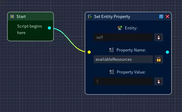 我们首先为铜矿石设置一个新的实体属性。 打开【设置实体属性】节点的表达式生成器,并选择【自身】作为实体类型。 属性名称设为【可用资源量】,属性值设为5,这表示该矿石含有5份铜矿石。 现在将此节点连接到【起始节点】。 步骤2