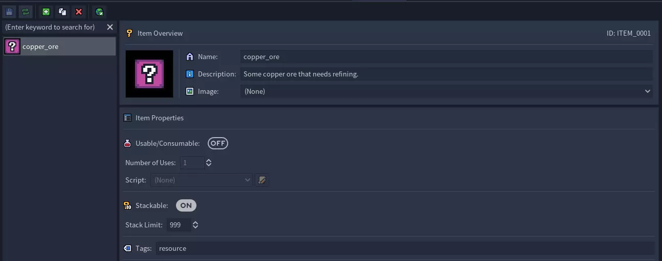 为了给玩家一些铜矿,我们必须先创建一个物品。 进入物品编辑器并添加新物品。 输入物品名称和物品描述。 将物品设为可堆叠,并选择堆叠上限。 你还可以为物品设置一些标签。 保存更改并返回脚本编辑器。 步骤9