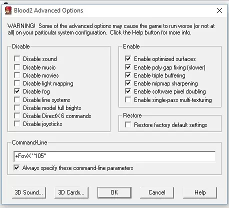 1. 从必备组件部分下载所有.zip压缩包并解压。 2. 找到你的《血兆2:天选者》安装文件夹(例如:D:SteamSteamAppscommonBlood II)。 3. 将解压得到的新CLIENT.exe文件移动到《血兆2:天选者》游戏文件夹中,覆盖原文件。 4. 在《血兆2:天选者》游戏文件夹中新建一个名为Custom的文件夹(不要引号)。 5. 将WidescreenPatch.REZ和WidescreenPatchNm.REZ文件移动到刚创建的Custom文件夹中。 6. 将dgVoodooCpl.exe文件移动到《血兆2:天选者》游戏文件夹,打开MS文件夹,然后将D3DImm.dll、D3D8.dll和DDraw.dll文件也移到该文件夹中。 7. (可选)打开dgVoodooCpl.exe文件并根据个人喜好配置设置。 8.通过Steam运行《血兆2:选民》,然后在游戏启动器中进入【高级】选项卡。 9*. 按照下方截图所示设置所有选项。