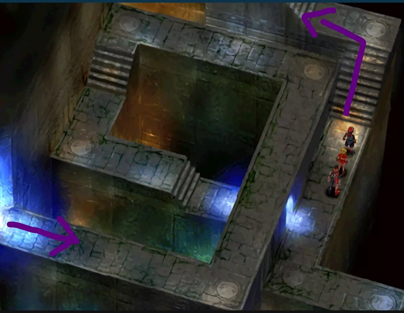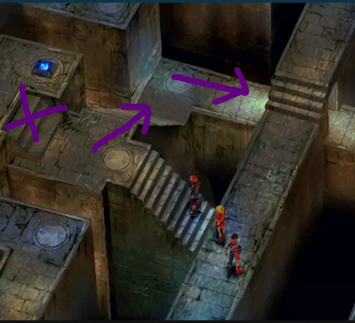继续前进,然后击败守护柱子的敌人,你就能点亮青龙雕像。 西北方谜题:摆弄那些假宝箱,直到路径通向带有蓝色发光的最大开口处。
