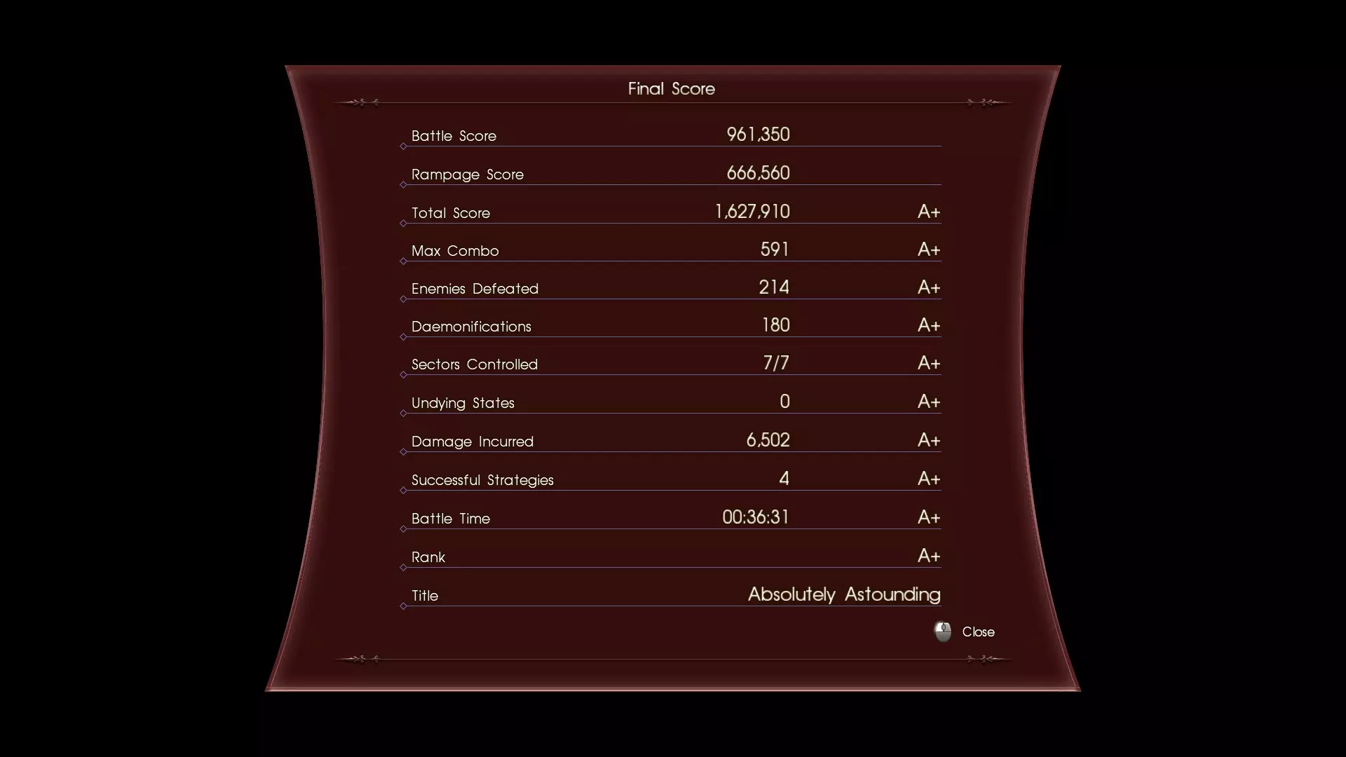 你需要获得A+级的总评价。最终评价基于你在每个列出任务中获得的等级。特别注意,总分只是要求之一——仅靠高分无法获得该成就。 最低要求是:至少有一项任务达到B级且其他所有任务均为A+级,或者至少有两项任务达到A级且其他所有任务均为A+级。 有些任务比较简单,而有些则更具挑战性。【受到伤害】是最难的一项,很可能是你未能获得成就的原因。 请注意,你可以在简单难度下获得该成就。当然,普通难度也可以,但建议你在二周目时选择简单难度进行尝试。 总分是战斗得分与狂暴得分的总和。只要专注提升狂暴评分,这个成就应该不难获得——我建议在前往最终 Boss 前至少达到 150 万分,以获得 A+ 评级。 通过击杀敌人可以提升战斗评分。如果通过恶魔化终结敌人,能获得更多分数(例如,普通击杀得 500 分,恶魔化击杀则得 2000 分)。尽量避免使用其他技能,直接使用 5 连击→恶魔化,尤其是在对付低等级守卫时。连续击杀敌人会获得倍率加成,但这并不是特别重要。你通常会在遭遇 3 人伏击时看到这种加成,此时可以立即进行三次恶魔化,所以不要搞砸这些机会。连击长度、战斗时间等因素似乎不会影响战斗评分。