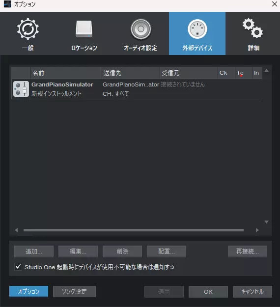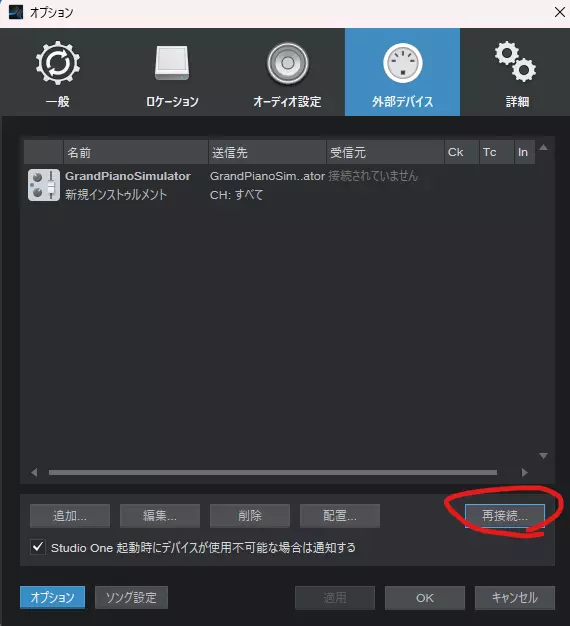 如果之前的设置正确,应该会显示MIDI输入设备中创建的虚拟MIDI端口。默认设置下会接收所有MIDI端口的输入,因此只要能确认创建的MIDI端口,就无需特别更改设置。 之后在DAW软件中播放MIDI文件,游戏就会开始演奏。 以上所有步骤已完成。辛苦您了! 无法正常播放时的解决方法 虽然不清楚具体问题所在,但已确认存在即使正确设置也无法播放的现象。虽然无法彻底解决,但请尝试以下解决方法。外部设备的重新连接:启动StudioOne5项目后,请从上方菜单栏选择StudioOne > 选项 > 外部设备。 ※请注意,此后可能会播放大音量※