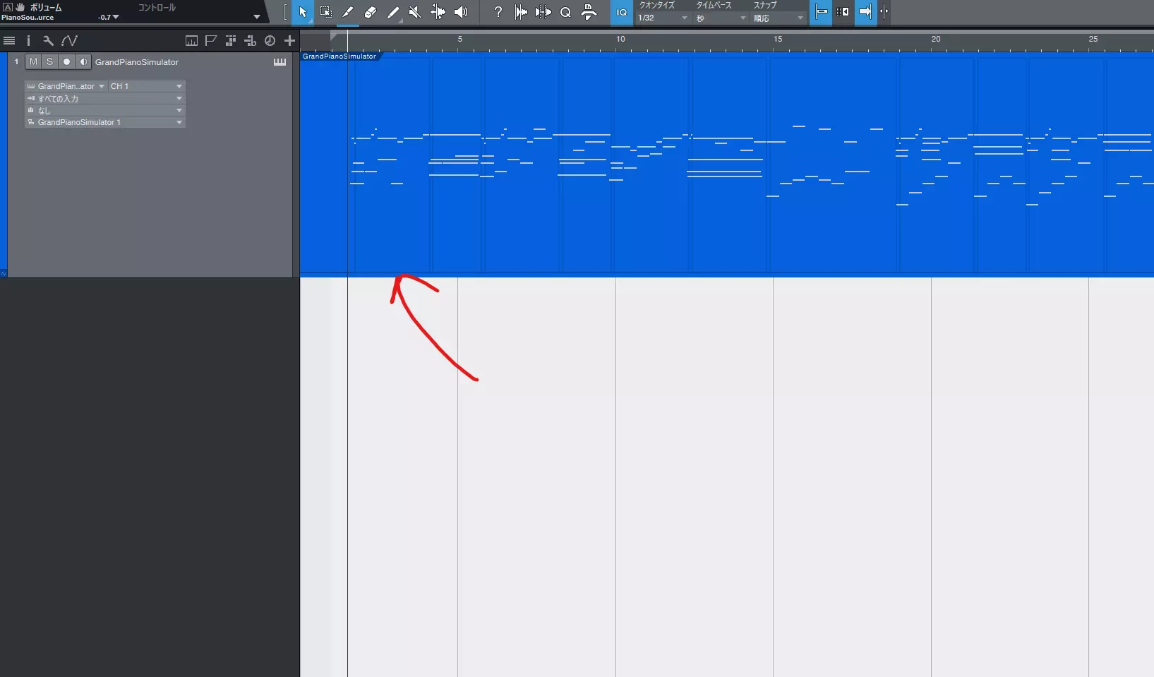 应该会像图片所示那样添加了新音轨。为了便于理解更改音轨名称后,请在箭头所示部分选择刚才创建的外部设备(本指南中为GrandPianoSimulator)。接下来进行MIDI文件的配置。