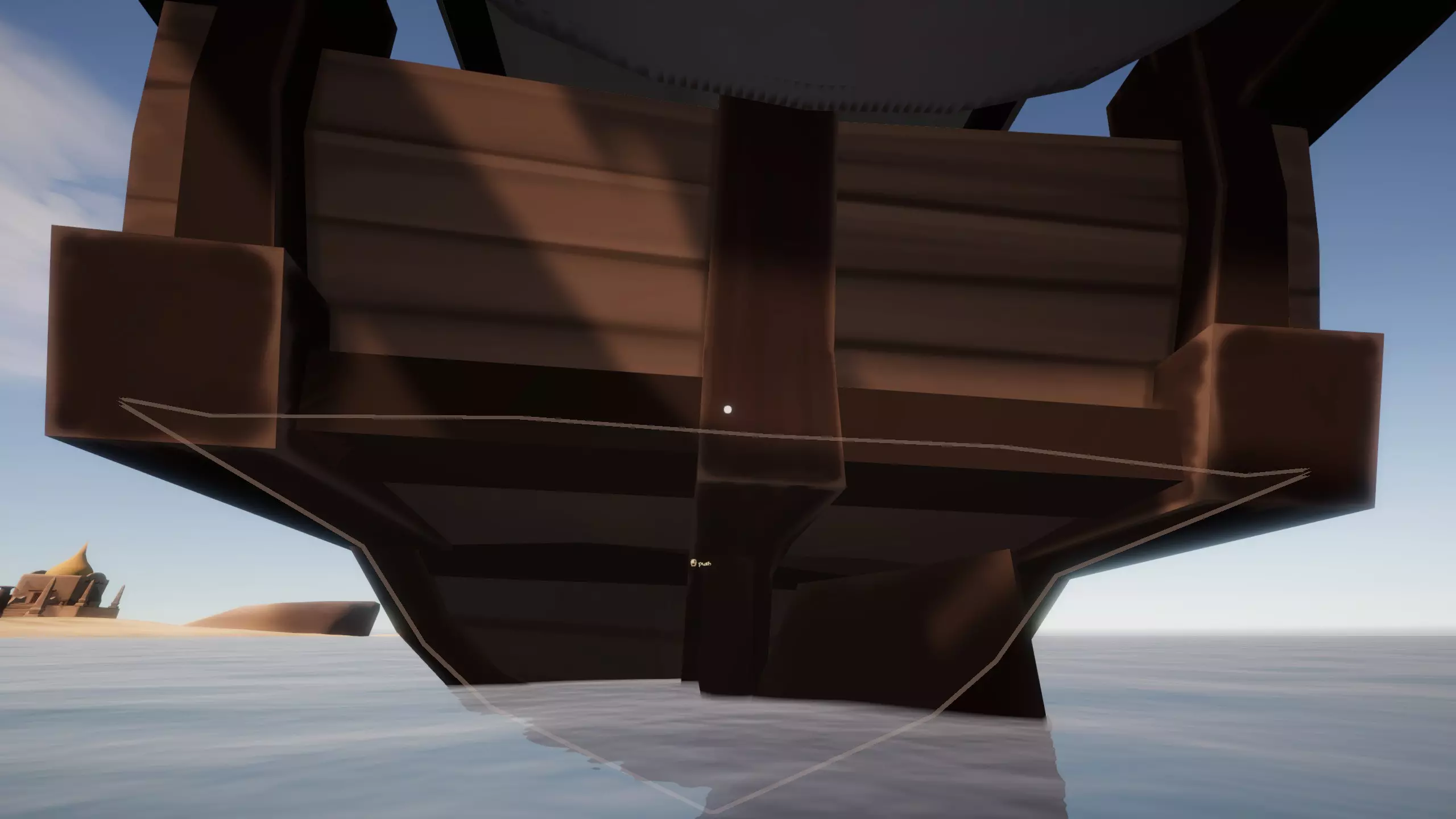 完成后跳下船,绕到船尾。靠近船尾时,会出现推动船只的提示。推动后,船只将驶离停滞区域,你可以重新登船继续航行。