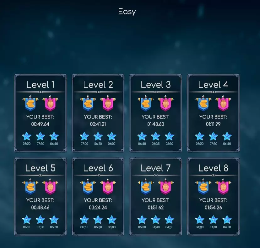 描述:在具有挑战性的中等难度下获得所有星星! 说明:你需要快速且谨慎地完成中等难度关卡,以获得尽可能短的时间,并在每个关卡中获得三星。 Hardcore Virtuoso
