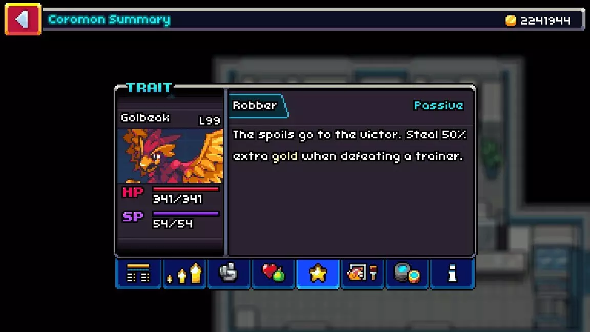 本指南旨在介绍多种提升游戏内收益的方法。 概述 游戏过程中通常获得的金币基本能满足所有需求。但对于购买游戏中最昂贵的物品——完美滑蛇(Perfect Slitherpin),本指南会非常有帮助。这只可鲁兽由达鲁迪克的商人出售,售价为3,194,000金币。 在我的上一轮游戏流程中,即便经常忘记佩戴【磁铁帽】,也没有在每场训练家对战中都使用【硬币掠夺】技能,最终仍攒够了购买完美滑蛇的金币。事实上,这并没有必要,因为我在游戏早期就已经获得了一只【强效20级滑针蛇】(而且在我的第一次通关中,还得到了一只【完美滑针蛇】)。 我让【电子石】和【高尔比克】加入队伍是因为它们的【强夺++】特性,而选择【铠甲龙】则是因为其【囤积++】特性。不过,我在游戏中途决定将【铠甲龙】移出队伍,之后又在更晚些时候移除了【电子石】。【高尔比克】基本一直留在队伍里,因为我真的很喜欢它的设计。 由于我玩的是疯狂模式,除非能找到并捕捉到完美的野生【科洛蒙】,否则无法获得具有这些特性的重复【科洛蒙】。说实话,即便有这样的机会,我也不会让重复的【科洛蒙】加入队伍。最大化每场战斗获得的金币 方法:佩戴【磁铁帽】并启用【金币磁铁】功能。 组建一个包含6只拥有【抢劫者++】特性的科洛蒙的队伍。其中一只科洛蒙应为【丝绒雀】(或持有【强化宝石】的【金翼雀】)*。 确保队伍中有两只科洛蒙持有【金块】。 在每场战斗中使用3次【硬币抢夺】技能。 注意事项: *【丝绒雀】及其进化链是唯一同时拥有【抢劫者】特性和【硬币抢夺】技能的科洛蒙。因此,将【丝绒雀】进化为【金翼雀】并装备【强化宝石】是明智之举,这将提高其在三回合使用【硬币抢夺】技能期间的生存能力。 【磁铁帽】(服装:头部装备)