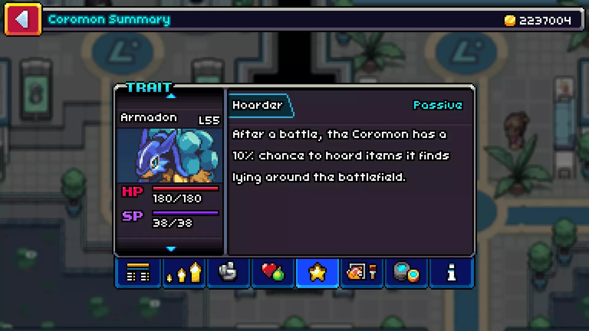 囤积者(被动特性) 该特性存在于【斑点比特】和【银鳞鱼】的进化链中。 除了初始伙伴外,你还能在纳尔逊教授的实验室获得一只斑点比特。 光辉公园是你首次能够捕捉这两种可鲁兽的地点。 注:你的队伍中拥有该特性的可鲁兽越多,每场战斗结束后获得的金币就越多。 拥有6只带有【掠夺者++】特性的可鲁兽能使收益最大化,但我不推荐这么做。
