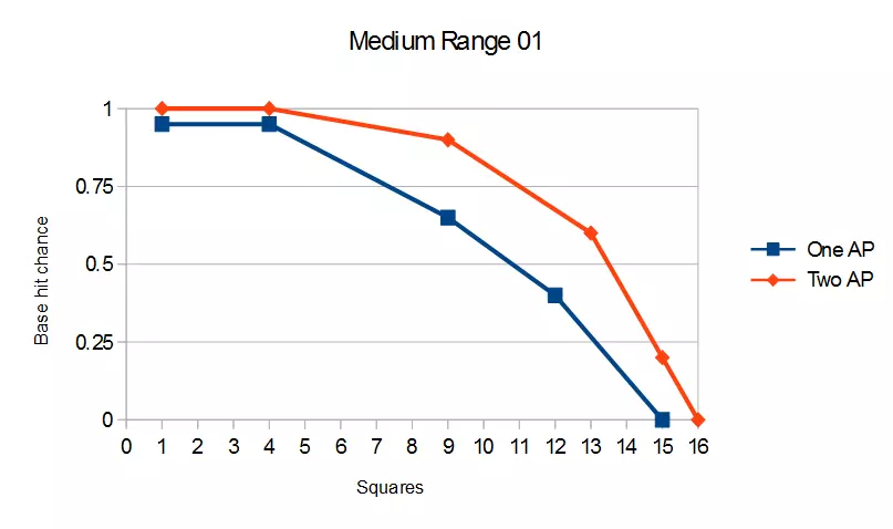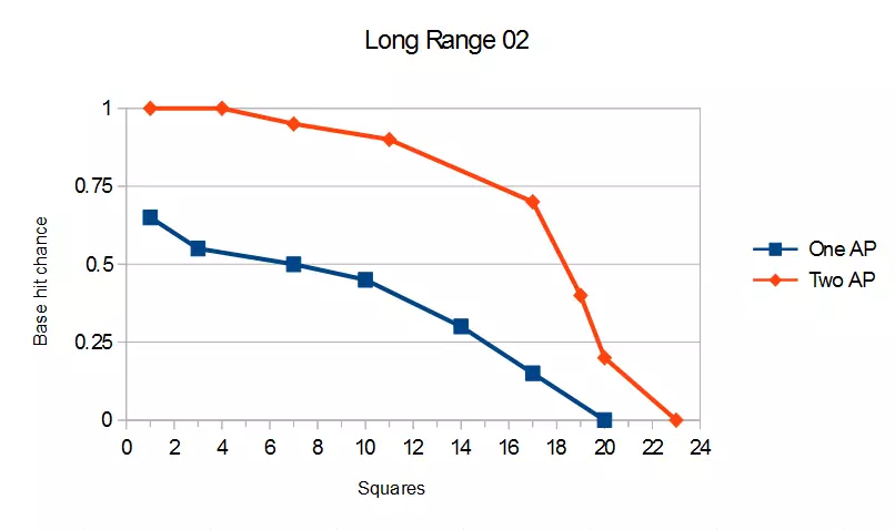 武器射程简易指南 简介 欢迎阅读这份《Halfway》武器射程指南。本指南内容较为基础,这些图表最初是我为自己制作的,但后来觉得其他人可能也会用得上。 我已尽量避免本指南包含剧透内容。 射击机制与武器射程 射击机制 在《Halfway》中,击中目标的概率受多个因素影响,其计算公式如下: 命中率=角色瞄准修正值+基础精准度-掩护加成 有两点需要注意: 1. 角色的瞄准修正值并非总是正值。若角色的瞄准值低于5,实际上会对命中率造成惩罚。 2. 掩护加成包含基于角色敏捷属性的命中率降低效果。我不确定当角色不在掩护中或被侧翼包抄时,这是否仍然适用。 基础精准度曲线 不同武器具有不同的射程。这里有一张对比各武器的图表。如你所见,短程武器的精准度会迅速下降,而狙击步枪在近距离时的表现始终不太理想。