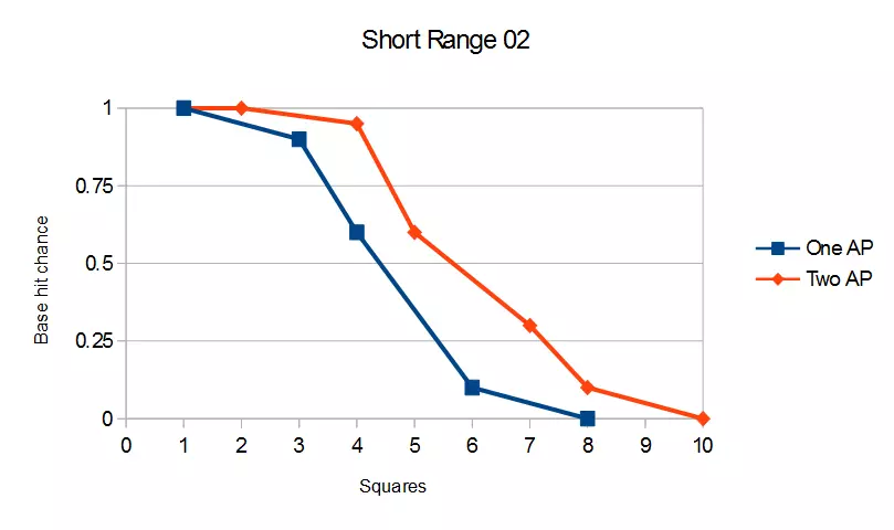 虽然消耗两个行动点确实能大幅提升命中率,但在移动距离方面的差异微乎其微,所以我通常建议你把行动点用在走近目标后射击,然后在下一回合进行两次射击。 手枪类型 手枪类武器采用【ShortRange02】精准度配置。目前能找到的采用该配置的常规枪械只有激光手枪,但也有部分独特武器同样使用此配置。没有敌人的武器使用这种射程配置。