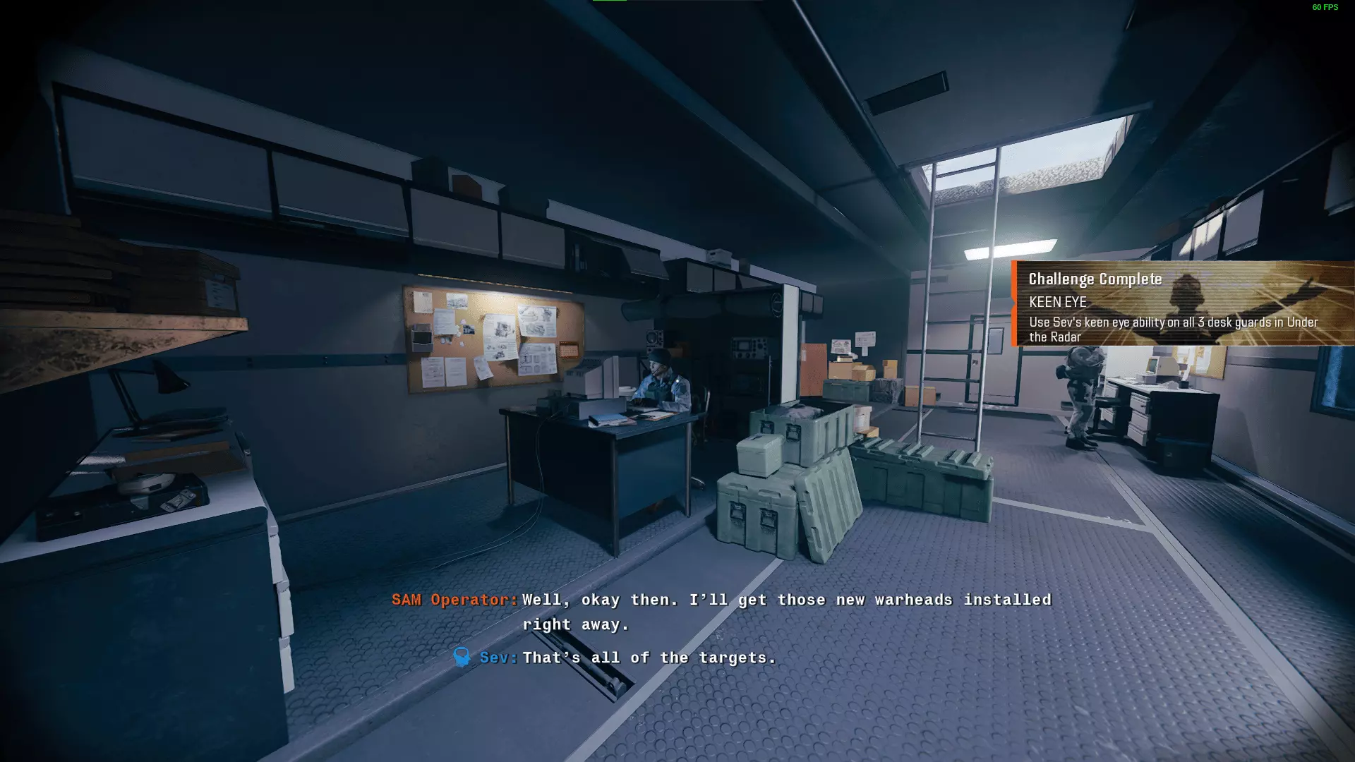 敏锐洞察:在“秘密行动”任务中,对所有3名办公桌守卫使用塞夫的“敏锐洞察”能力。 总共有3名守卫,每个目标点各1名。在完成每个目标前,先与对应的守卫坐下交谈,并每次都使用“敏锐洞察”对话选项。环顾四周并收集每个目标点的所有情报,这样就能解锁该成就。解锁此成就的关键在于,你必须完成每一段对话回应,不要尝试以其他方式破坏目标。 前往雷达天线处,与该守卫进行如下对话: (任意选项)>> 敏锐洞察并环顾四周 第二个选项(11A)>> 第一个选项(惠特曼中士)>> 第二个选项(杂波模拟) 这样就完成了对他的操作。前往直升机守卫处,按以下对话与他交谈: 敏锐洞察 >> 环顾四周 第二个选项(法国外籍军团)>> 第三个选项(留给你的姑娘们)>> 第一个选项(贝策上尉) 转身,在叉车上的货物处安装C4。 与叉车旁的两名士兵交谈,告诉他们“去吧”。然后你就完成了。 下一个守卫在萨姆导弹基地,但不要去找他,而是直接进入萨姆导弹基地守卫正南方向的建筑,会发现一个持枪睡觉的男人。进入他面对的房间,拿起断线钳。然后前往地对空导弹阵地守卫处,与他进行如下对话: (任意选项)>> 敏锐观察并环顾四周 第二个选项(白俄罗斯)>> 第一个选项(定于明天)>> 第二个选项(制导芯片,GCX-78)>> 退出对话 径直向北走,到垂直集装箱的左侧,撬锁进入该集装箱。向左看,再打开另一扇通往外部的门。 沿着左手边一直走,直到找到一扇通往装有弹头的水平集装箱的后门。打开门并破坏导弹。 返回至 desk guard 处,再次与他交谈。