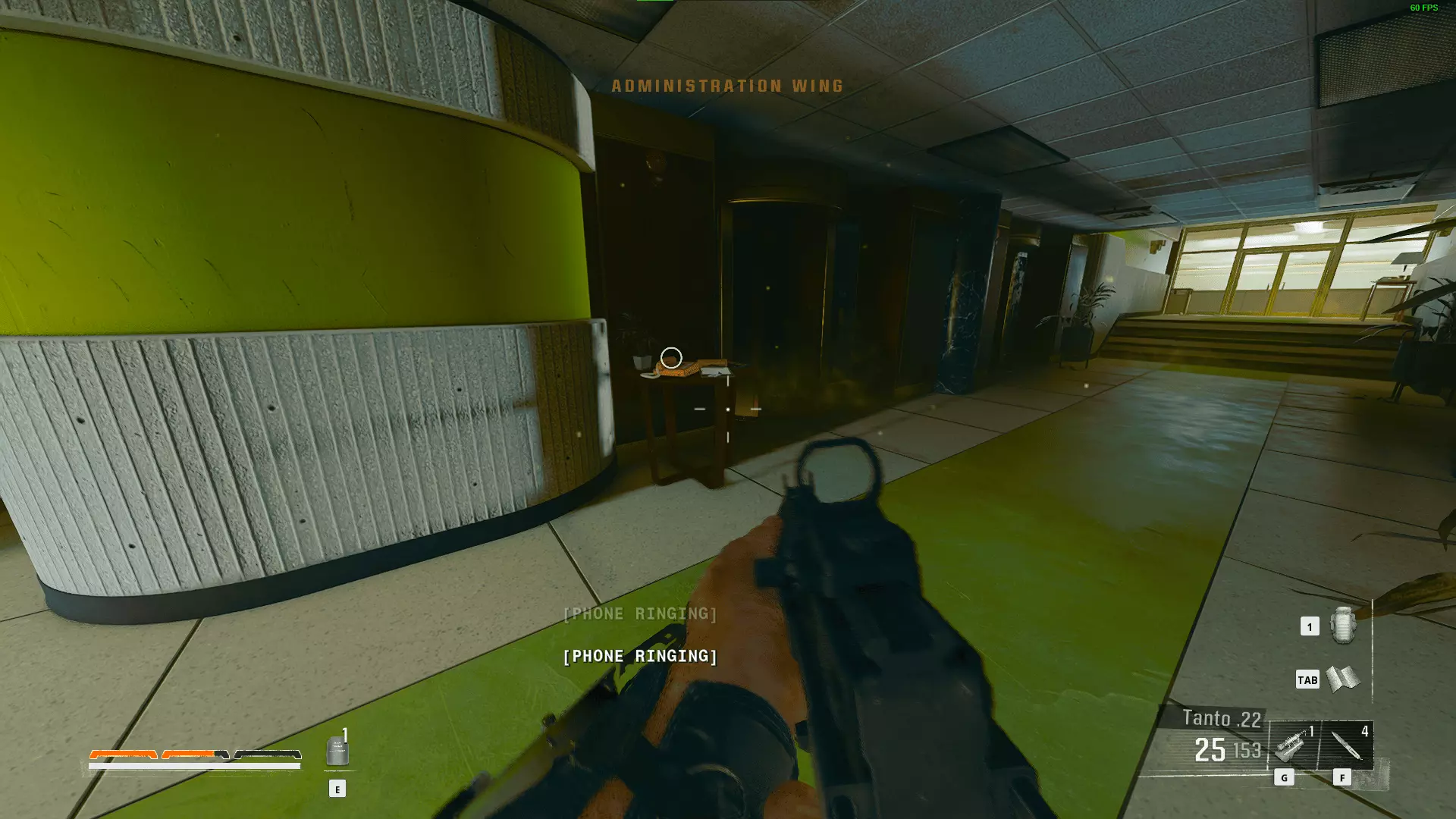 回到楼梯处,但不要穿过双扇门,转身看向对面的阳台,使用抓钩并向前跑一段距离,在走廊交叉处过后的左侧就能看到另一部电话。