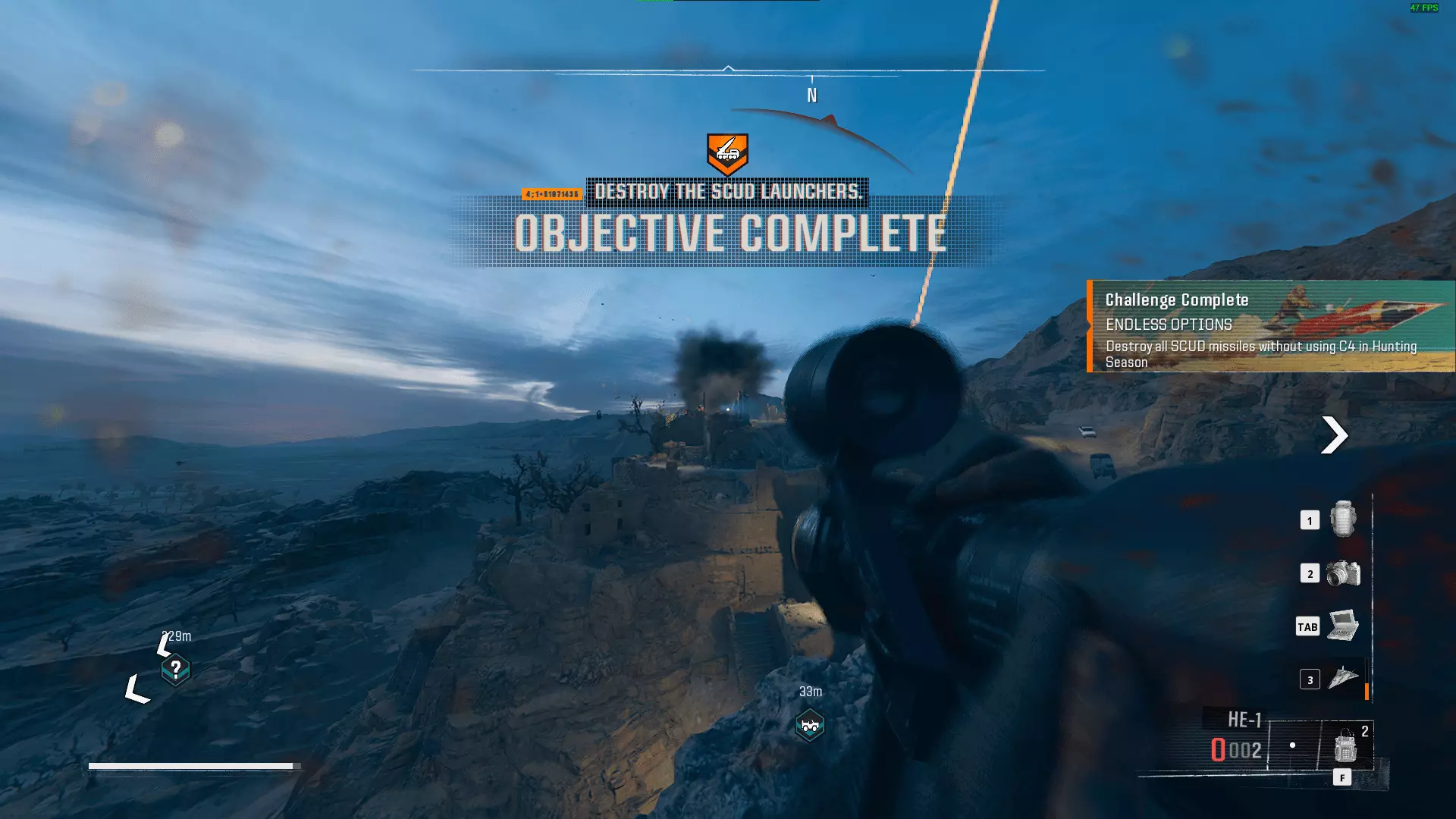 无尽选项 - 黑色行动 在“狩猎季节”任务中,不使用C4摧毁所有飞毛腿导弹 第一个飞毛腿导弹在不使用C4的情况下很容易被忽略,但当你接近导弹时,你的右侧就有一个火箭筒。前往格拉德尼驻守的位置并转身,你应该会看到它靠在一个箱子旁边。
