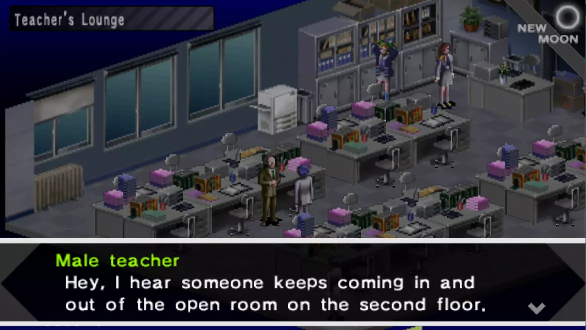 招募玲司(简短版) 游戏开始后,在前往御影医院探望真树之前: 1. 与1楼教师办公室的老师交谈,他在学校出入口附近。 2. 前往2楼的空教室,首次遇见玲司。需要进入的教室位于地图的东南区域。 3. 与2 - 1班内的男学生对话。 4. 前往欢乐街的便利店,与玲司的母亲交谈。告诉她你认识她的儿子,并且很乐意成为他的朋友。 5. 前往同一家商场内的赌场,与这里的金发男子交谈。你会得知玲司喜欢去废弃工厂。 6. 前往废弃工厂,第二次遇见玲司,他会再次立刻离开。完成“变形御影医院”迷宫后: 1. 前往SEBEC大楼,在世界地图上接近挡住道路的守卫。会触发涉及玲二的剧情。 2. 当布朗、艾丽或绫濑请求加入队伍时,拒绝他们。 3. 完成SEBEC大楼后,会第二次前往圣白百合学园;在清理这个迷宫时,会触发与玲二的剧情。如果之前步骤都正确,他会在此剧情中加入队伍。 招募玲二(详细版): 1. 游戏开始时,当你在护士办公室外,需要向北找到入口。从学校入口前往附近的教室。与老师(下图所示)对话,他会让你查明是谁进入了二楼的封锁房间。