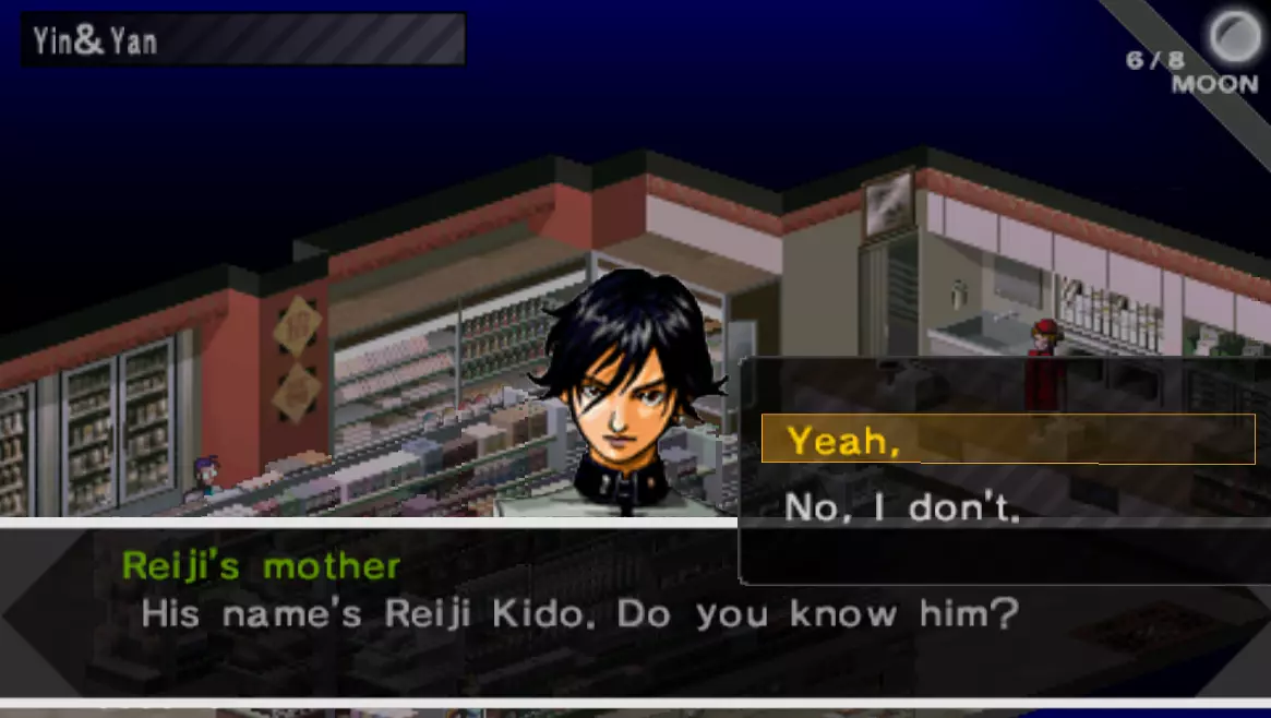 2.老师提到有人溜进了二楼的一间空教室;前往二楼地图东南部的空教室,你将首次遇到怜司。 3.遇到怜司后,与2-1教室内的男学生交谈,他会告诉你关于小混混的事。完成这三件校内事情后,你就可以自由离开了。 4.我们的下一站是欢乐街商场的阴阳堂,你需要在那里与怜司的母亲交谈(如下图所示)。 与怜司的母亲交谈并选择以下回应: 选项1:嗯。 选项2:当然。