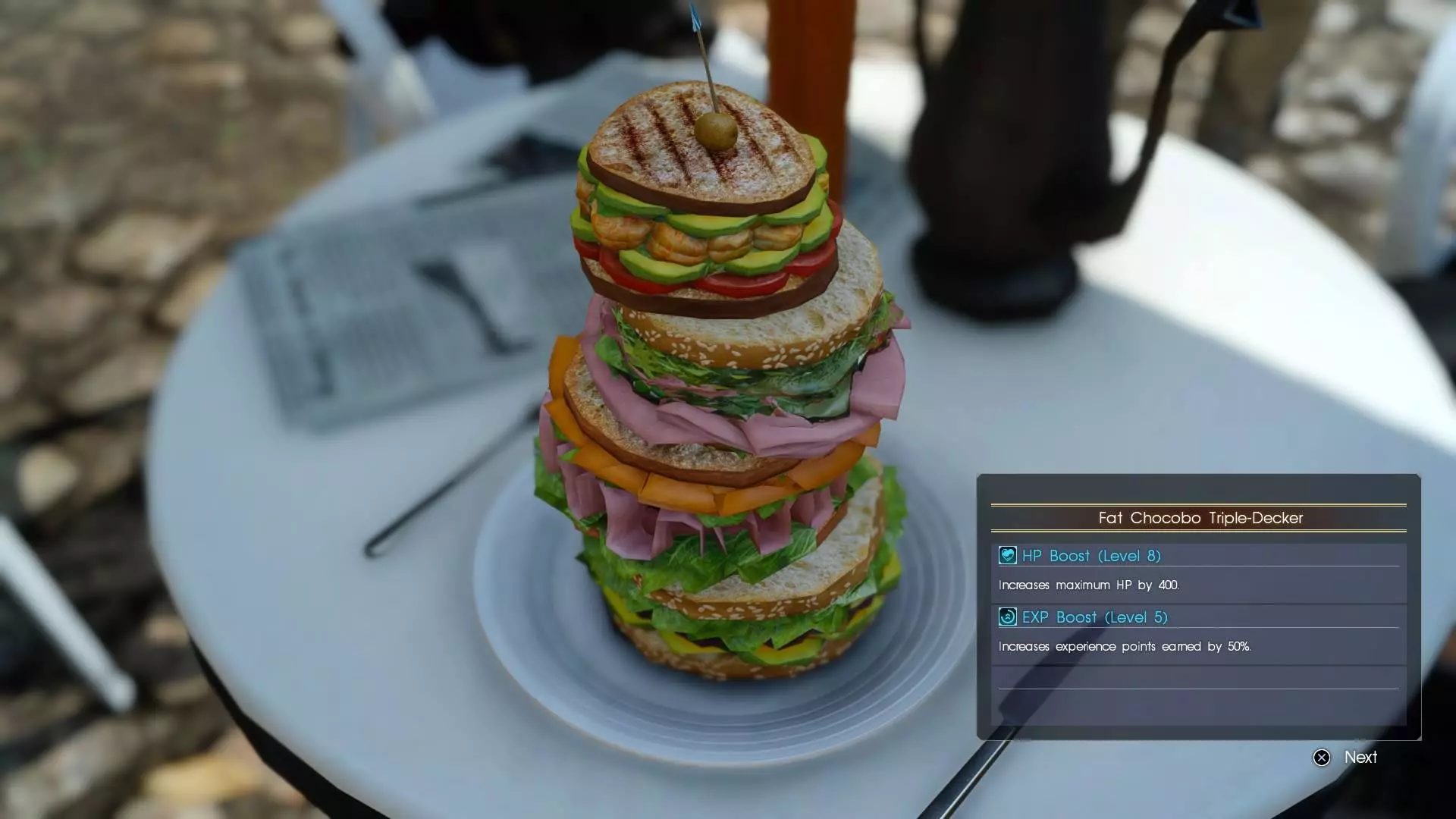 (经验值提升20%):当你完成第8章的发电厂主线任务后,前往主干道上的杯面摊贩处,格拉迪欧会触发新任务【完美的一杯】。你选择的食物会改变任务的后续部分,但最简单的无疑是鸡蛋,这会让你前往相对 straightforward 的拉瓦托格之岩地牢,在通往终点陵墓的关键路径上拾取一个鸡蛋(其他食物选择会涉及更具挑战性的敌人遭遇战)。完成后,进行露营,过场动画后你将学会杯面食谱,使队伍获得20%的经验值加成。如果之后想多烹饪,唯一的杯面食材可以在杯面摊贩处以220吉尔的低价购买。 胖陆行鸟三层堡