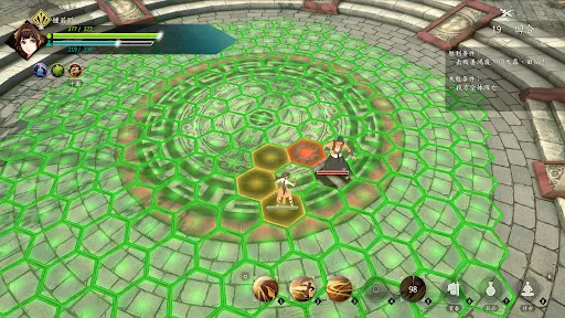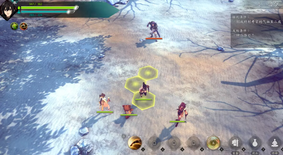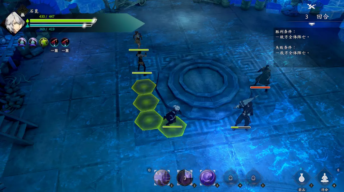 第二场开局主角向左下方撤退两格,钟若昕使用再动技能,计算好步数加成后的距离向左撤退,确保下一轮刚好能支援到唐韵,其他两人保持原位。唐韵下来后,钟若昕先对段红儿发动侧袭,主角切换水属性功法,配合乖乖进行补刀将其打残。第二轮,钟若昕击杀唐韵,段红儿去攻击金属性敌人,乖乖负责补血,主角继续补刀。之后充分利用钟若昕的移动距离优势,对敌人进行风筝战术,最后一轮由钟若昕单独击杀剩余敌人(其余三人未行动)。