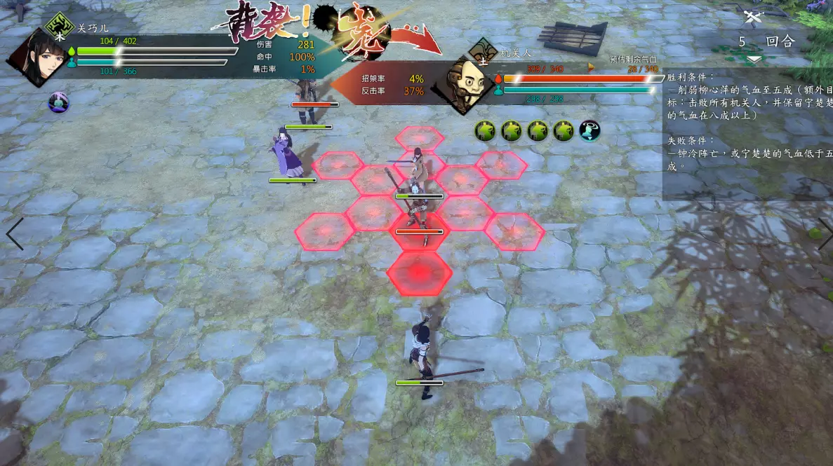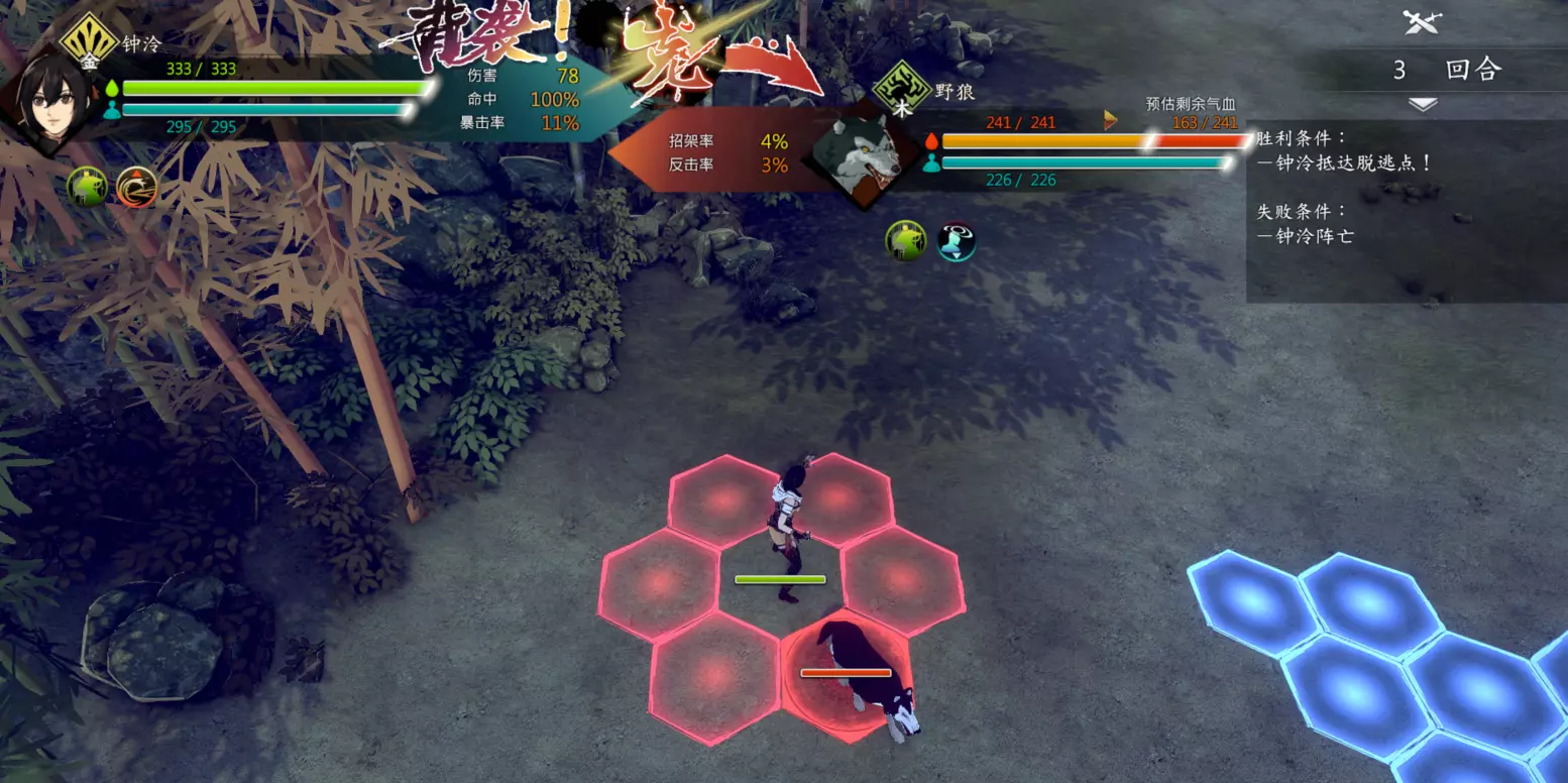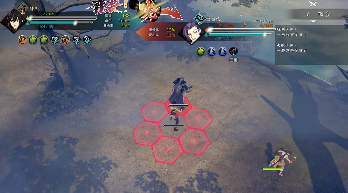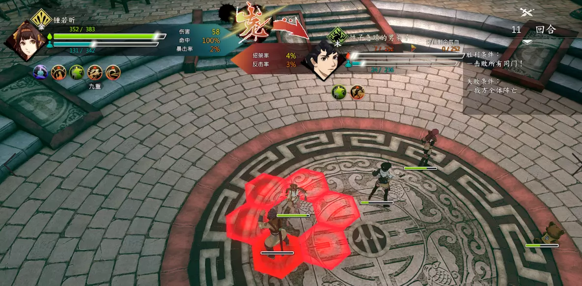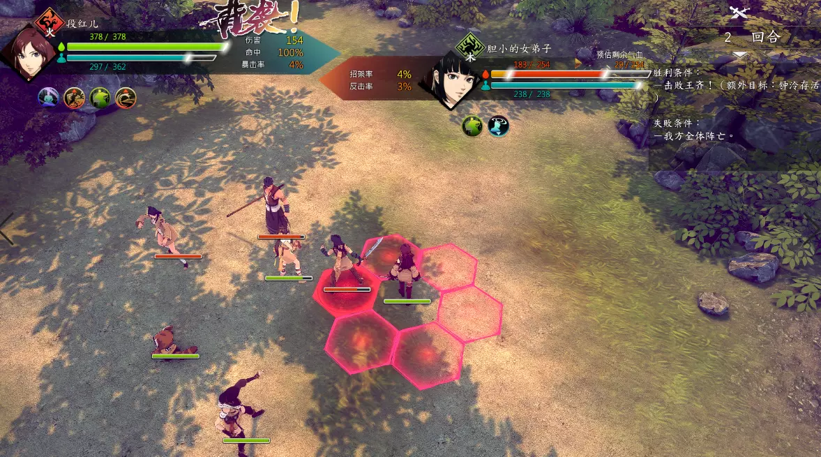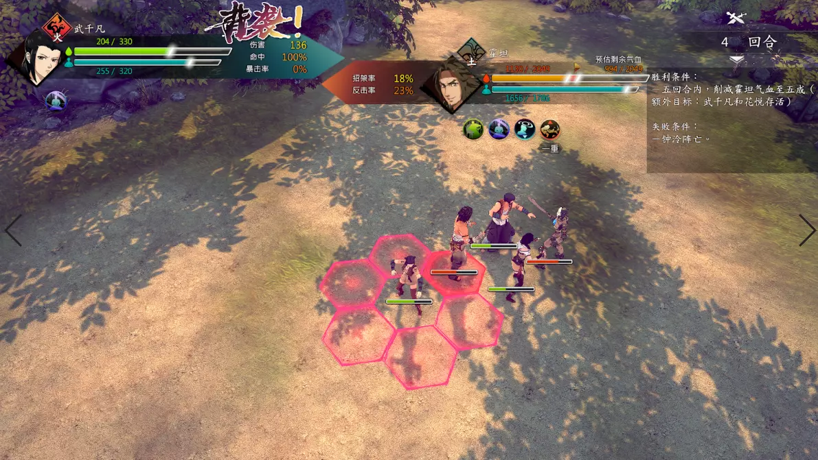 第二回合:如图,钟若昕前往木属性敌人最侧面发起进攻,配合段红儿背袭消灭该敌人。主角攻击左侧火属性敌人,若敌人闪避或招架可使用【存档读档】操作。本回合敌人会集火攻击钟若昕,导致钟若昕血量告急。
