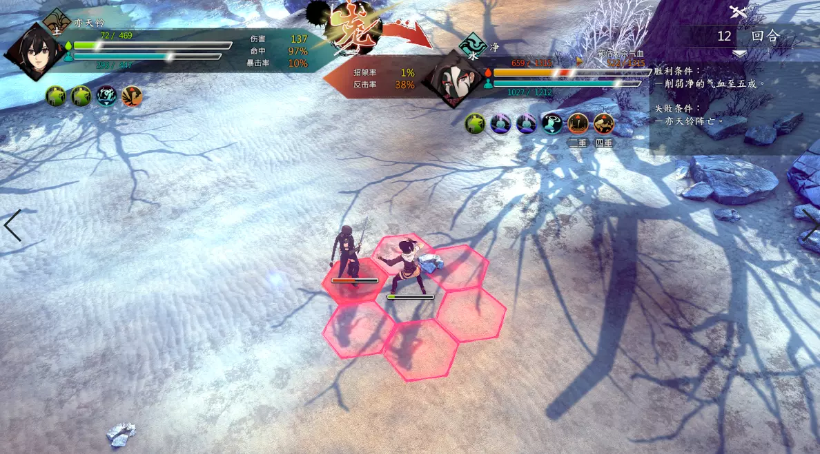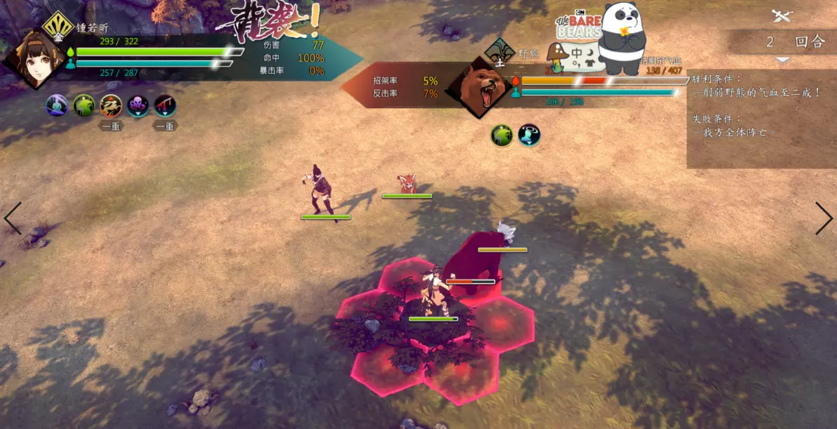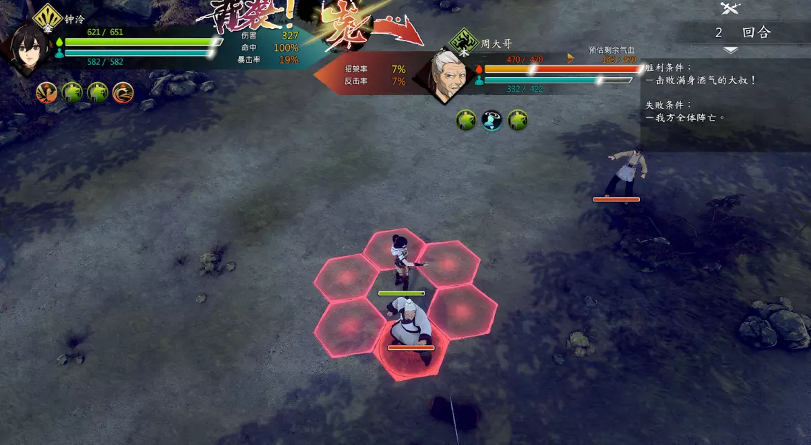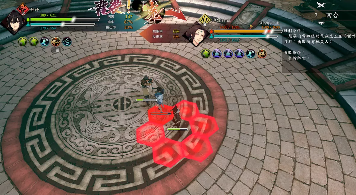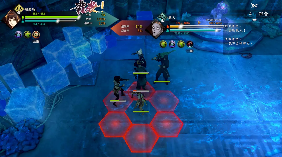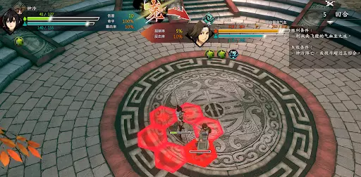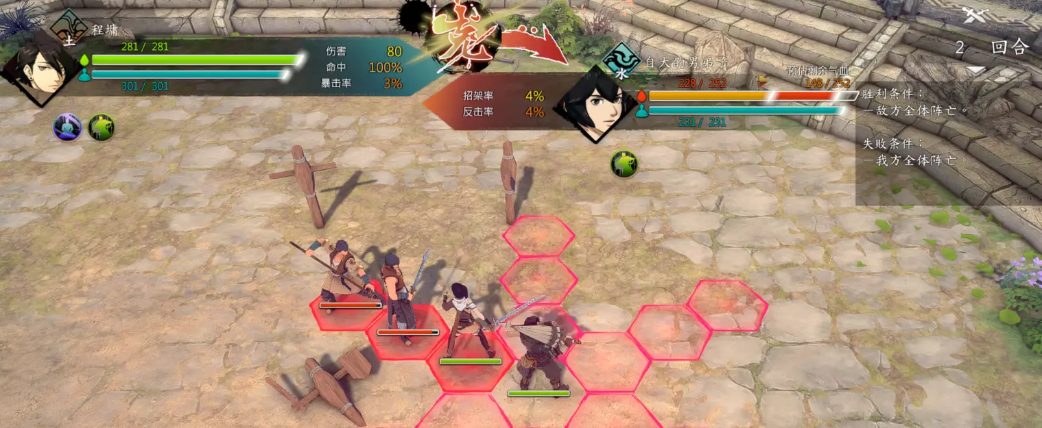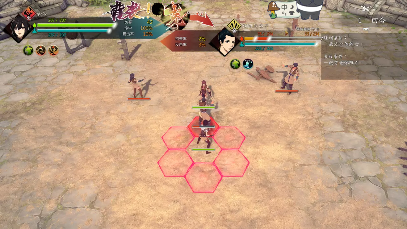 第二回合:如图,钟若昕前往木属性敌人最侧面发起进攻,配合段红儿背袭消灭该敌人。主角攻击左侧火属性敌人,若敌人闪避或招架可使用【存档读档】操作。本回合敌人会集火攻击钟若昕,导致钟若昕血量告急。