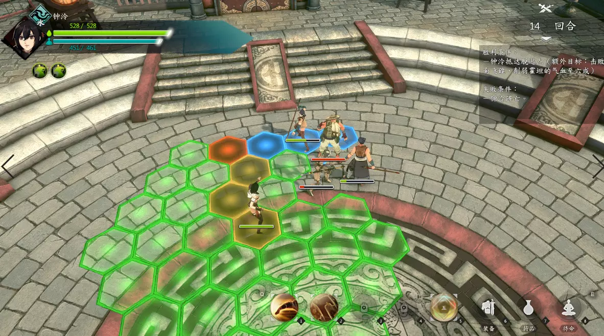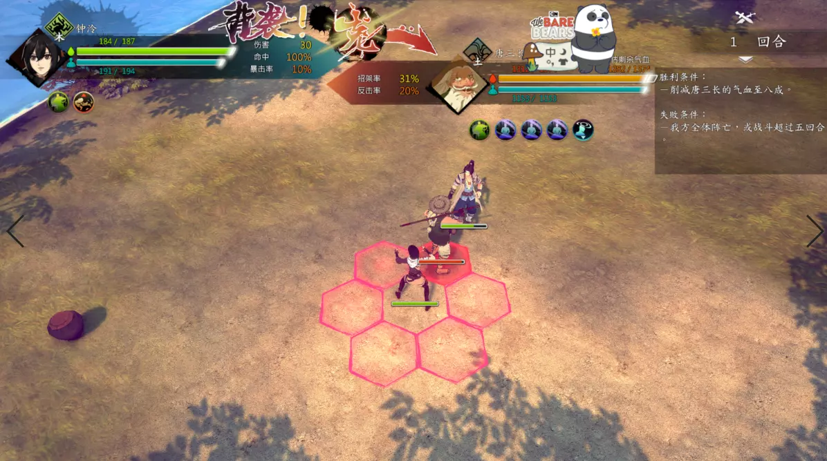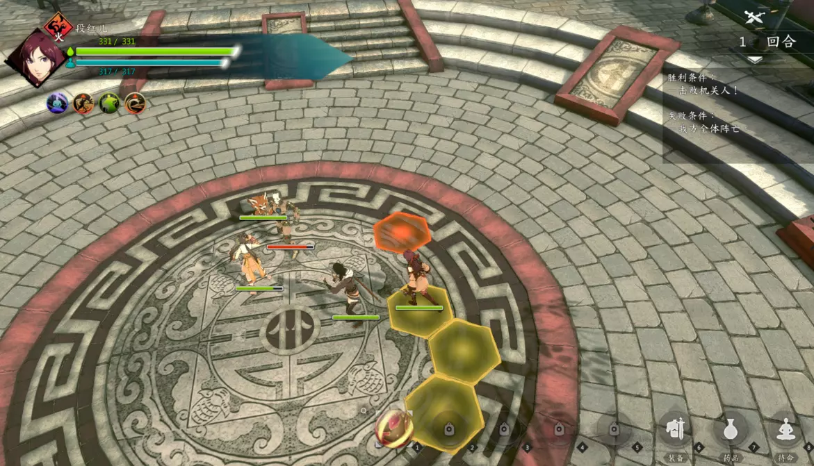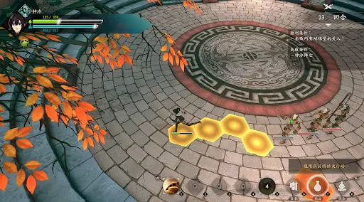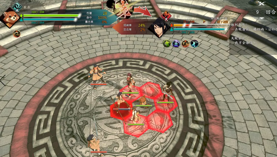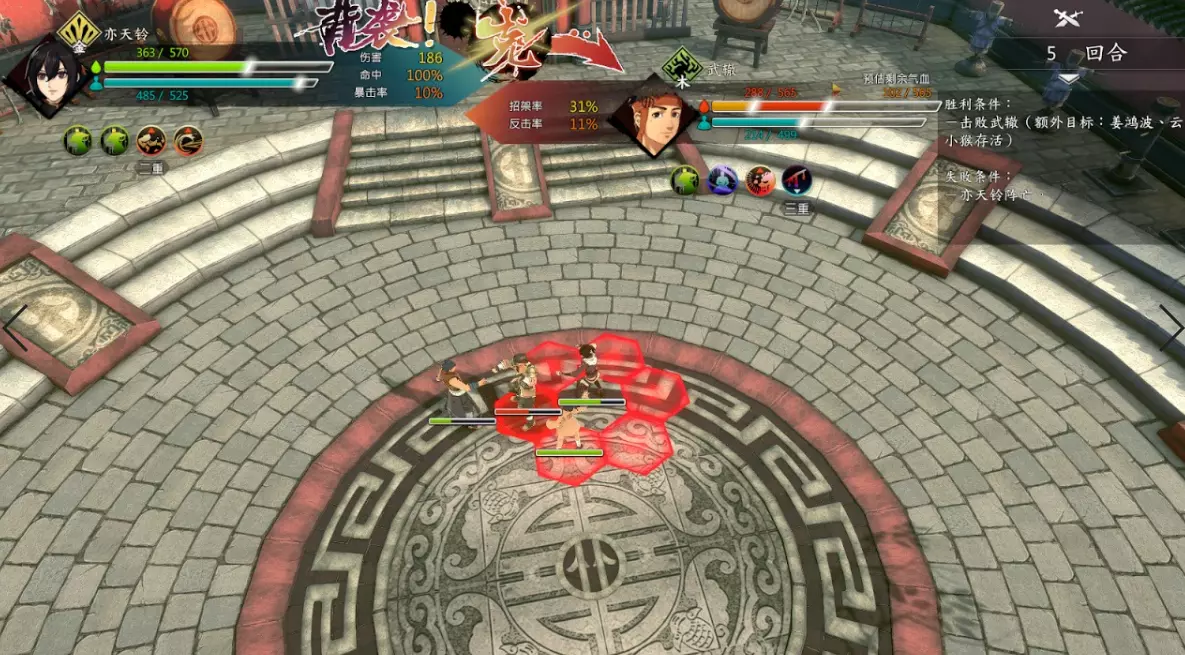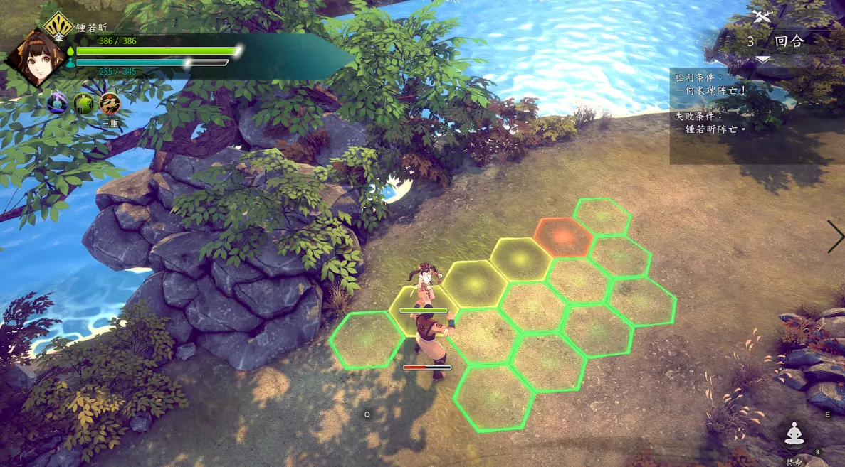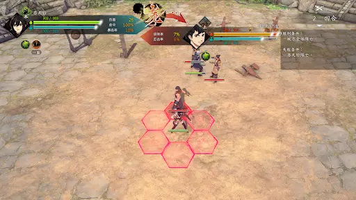 第二回合:如图,钟若昕前往木属性敌人最侧面发起进攻,配合段红儿背袭消灭该敌人。主角攻击左侧火属性敌人,若敌人闪避或招架可使用【存档读档】操作。本回合敌人会集火攻击钟若昕,导致钟若昕血量告急。
