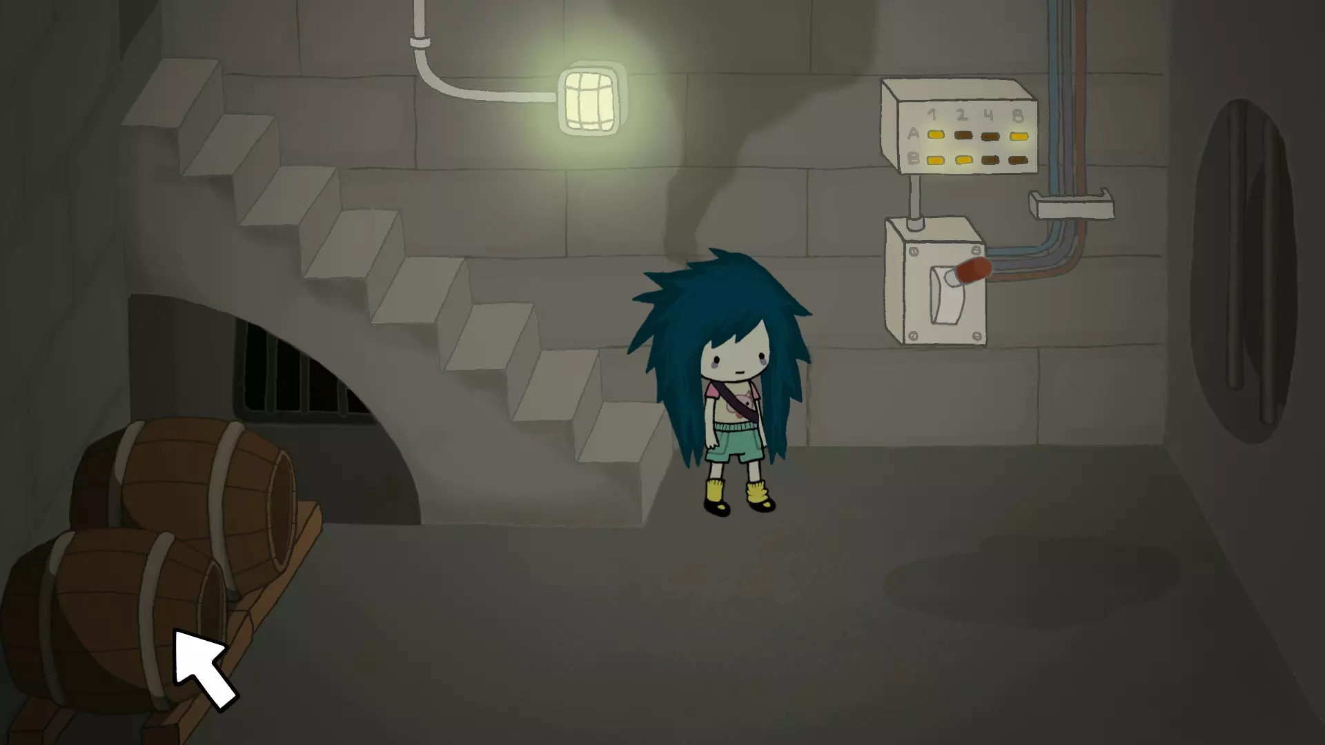 你说服了猪成为食肉主义的殉道者+你让农场的水车运转起来了。 当所有其他动物都离开农场后,你会发现谷仓右侧外面还剩下一头猪。 让这头猪喝下桑多尔的鸡尾酒,并说服它谷仓就是“伟大的流血之猪”。 要做到这一点,你需要从屠夫那里拿到空桶,以及从妮卡阿姨农场谷仓内的地下室里找到绳子。当妮卡的阿姨在外面干活时,你就能进入地下室。拿到绳子和桶后,去外面的井边。 用绳子和桶在井边操作,直到打满一桶水。 回到地下室,把桶放在杠杆上,当灯光变成这样时取下桶。(见下图)
