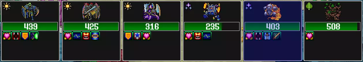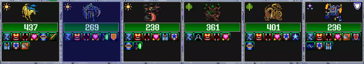 这张截图展示了我在第29领域的传送门中进行一场普通战斗后的队伍状态。获胜后,所有单位都获得了增益效果并恢复了生命值。 不必在意具体的单位,重点在于总体的游戏玩法——通过治疗获得增益效果,搭配一名魔法伤害输出和一名近战伤害输出,全力击杀敌人。 这个例子是我经过大约13小时悠闲游玩后组建的队伍。它的效果非常好,而且随着游戏的进一步展开,我能看到多种优化的方向。 第一个生物:神圣施法者独角兽与远古之灵的融合体——持续提供增益效果并治疗单个目标。 第二个生物:女武神斥候与活化独角兽的融合体——近战伤害、复活以及反击能力。第三只生物:眼蛭与活化独角兽融合——第二个复活者兼增益吸取者——所有友方的近战攻击在命中时治疗,并在每回合触发更多增益效果。 第四只生物:铁杉树精与乌木树精融合——通过修复、百分比治疗以及两只树精技能的协同效应,在每个生物回合开始时进行治疗。更多增益效果! 第五只生物:目前几乎是无用的占位符……末日巨斧手与沙巨人融合——尝试获得每回合的属性增益,但目前战斗持续时间不足以使其物有所值。解锁更多生物后会替换它。第六种生物:奥术构造体与纵火狂融合体——可对敌方近战单位施加减益效果,并且每当友方单位施放任意法术时,会自动施放一次魔法伤害攻击,堪称魔法输出核心。 更新于12.05.21:此截图展示了我游玩约23小时并达到第41领域后的队伍,队伍仍在不断进化中。